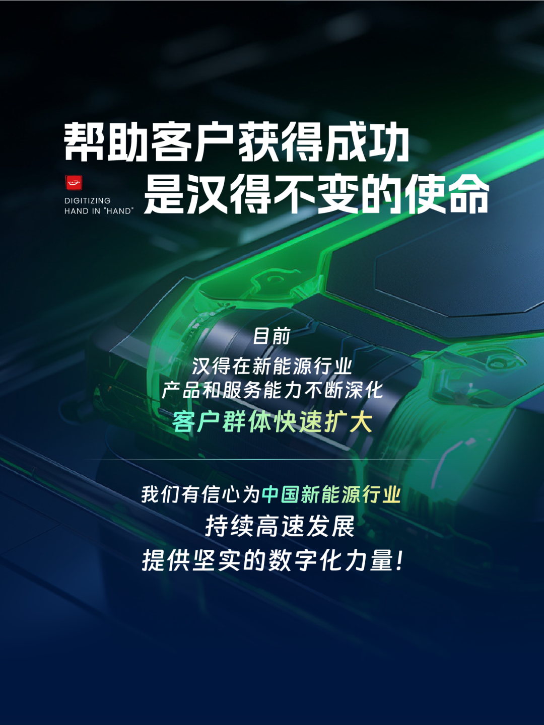 帮助客户获得成功是汉得不变的使命。我们帮助某头部动力电池企业,在不到3年的时间,搭建起行业领先的数字化体系,支持该企业近10倍的产能扩张;我们帮助某头部锂电池企业,通过3个月的时间,快速搭建起多条高标准的生产线,达到顶尖车企的产线审核要求。
