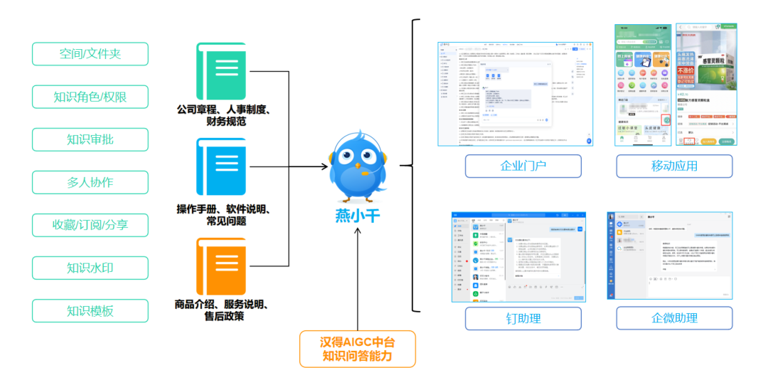 集燕千云知识管理 + AIGC中台知识问答 + 多渠道嵌入为一体的数字助理燕小千,为企业内外部用户提供一触即答的问询解答服务。