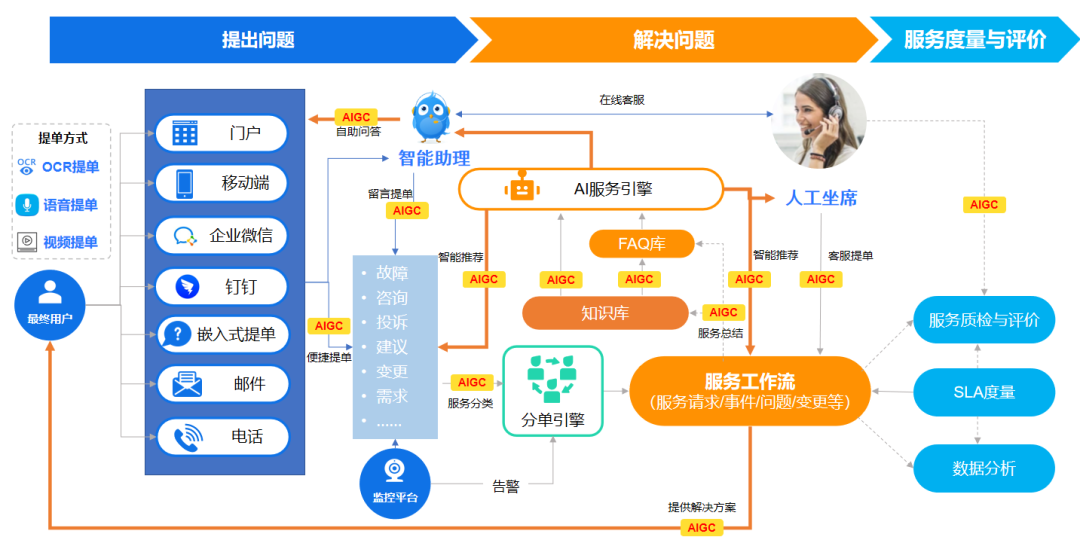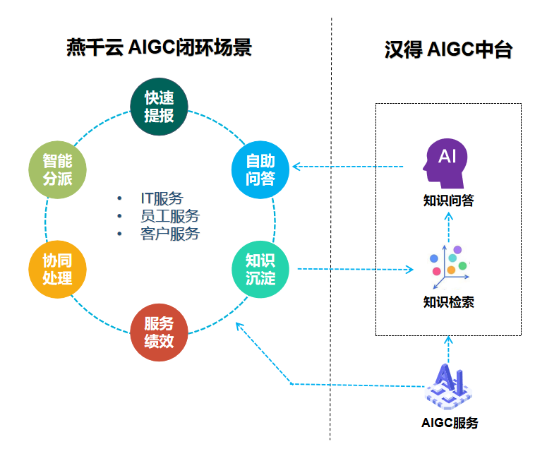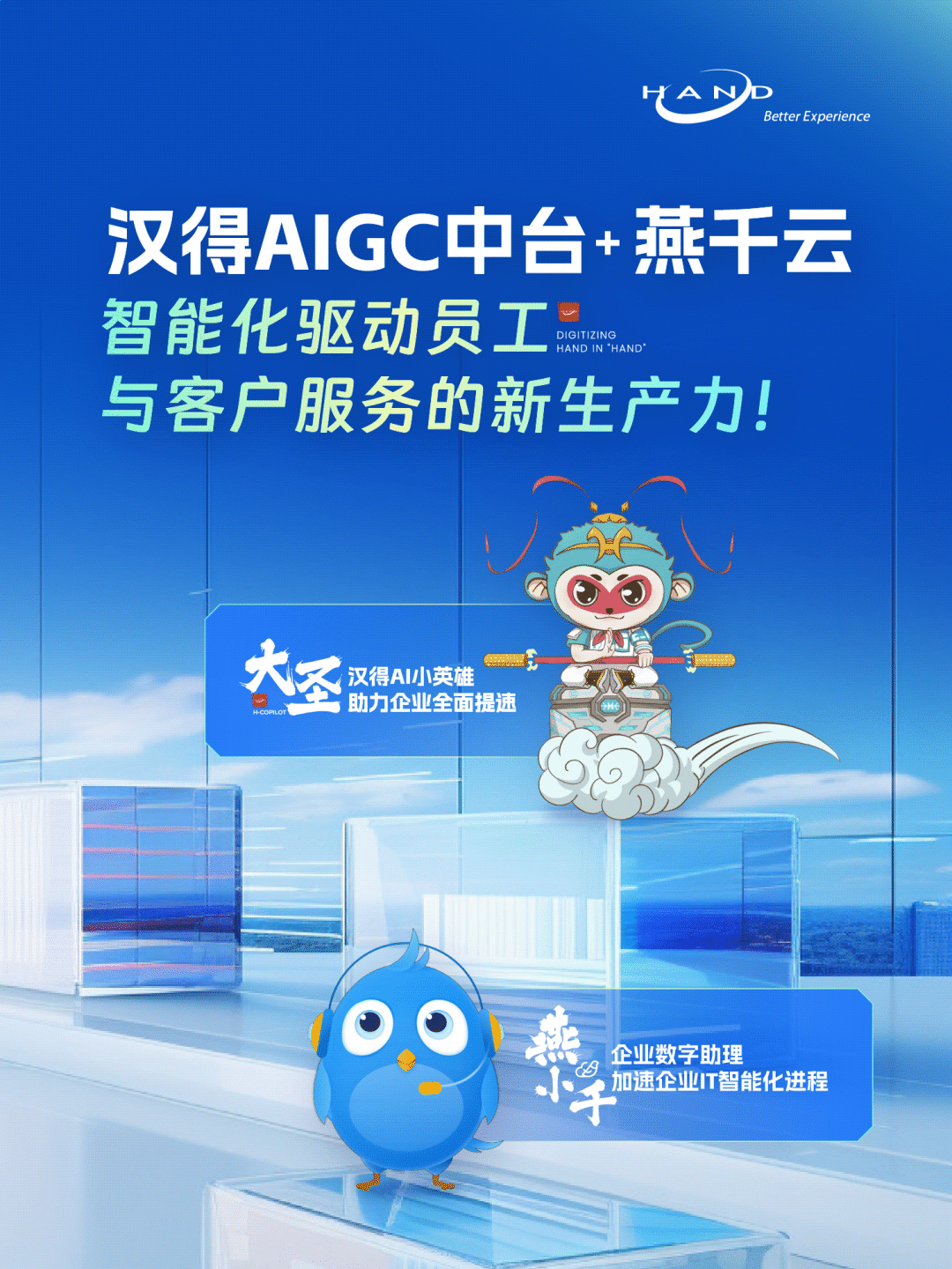 2023年是AIGC的爆发之年,随着AI进入大模型时代,AIGC也成为当下最热门的新型生产力工具,每个业务和每个产品都值得用AI重做一遍也越来越成为共识。如何快速使用AIGC来使AI的能力场景化落地,真正做到业务创新的AI赋能,已是业内热点关注的问题。燕千云SaaS服务依托于汉得HZERO的PaaS平台能力,帮助企业实现服务流程闭环。目前,燕千云也是基于汉得AIGC中台打造的典型和成熟的应用产品之一。燕千云SaaS服务平台基于汉得HZERO原生态AIGC能力,对企业内部的IT服务、员工服务、客户服务进行场景重铸,并以低成本、短周期、低门槛部署解决方案,为企业提供更高效率、更好体验的“强IT”服务体系。自助问答 + 人工提报响应用户各类诉求01 智能问答盘活企业知识集燕千云知识管理 + AIGC中台知识问答 + 多渠道嵌入为一体的数字助理燕小千,为企业内外部用户提供一触即答的问询解答服务。02 智能提单解放员工时间燕千云可以通过SDK嵌入各类工作软件中,用户对知识问答不能解决的诉求,可以随时随地的发起提单或联系在线客服。汉得AIGC中台升级用户的提单方式,让工单提报变得简单,减少工单录入工作量,文字转工单,一步到位。服务人员 + AI助手一站式解决用户诉求03 智能分单加速服务流转汉得AIGC中台自动为单据生成分类和标签,燕千云分单引擎依据分类和标签将服务单据交给最合适的服务人员,不必再苦恼单据无人认领和错误认领。04 智能总结方案一键生成燕千云服务工作台提供工单的一站式服务解决过程管理,沟通过程、排查记录、SLA、工时、单据关系等一应俱全,通过汉得AIGC中台对服务沟通记录一键归纳解决方案,让服务过程无比顺畅和高效。05 智能质检服务质量监督燕千云提供服务规范定义和质检流程,汉得AIGC中台助力员工服务质检,对完成的服务进行一键质检和智能评分,协助监督并指导服务人员更好地服务用户。服务总结 --> 知识沉淀持续进化知识问答燕千云已被解决的服务单据可以一键转化为知识,实现企业在日常工作中沉淀知识的闭环流程,持续进化AIGC知识问答的能力。汉得AIGC中台助力知识沉淀,将服务工单解决方案提炼为标准格式的FAQ,助力服务人员为企业生产高质量的知识内容。燕千云SaaS服务平台凝结了汉得20多年的企业数字化服务经验和对企业数智化建设的深入理解,立足于企业IT、员工、客户服务场景,通过汉得AIGC中台能力 + 企业服务行业经验,专注于“强IT”产品级解决方案,帮助企业解答如何更高效地建设和运营IT基础设施和应用,智能化驱动员工与客户服务的新生产力。