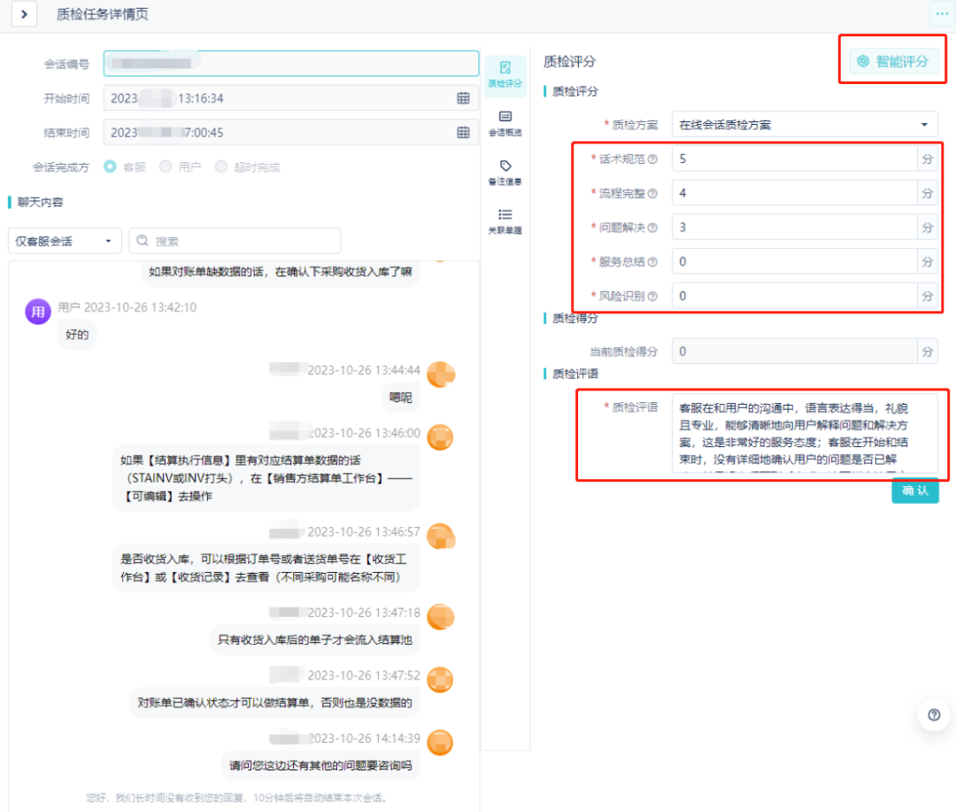 燕千云提供服务规范定义和质检流程,汉得AIGC中台助力员工服务质检,对完成的服务进行一键质检和智能评分,协助监督并指导服务人员更好地服务用户。