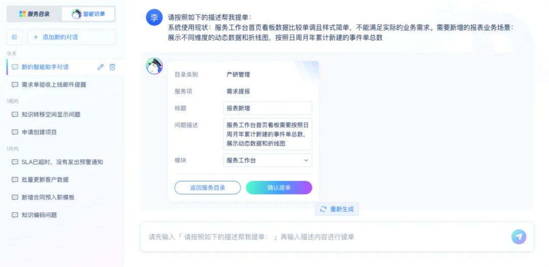 汉得AIGC中台升级用户的提单方式,让工单提报变得简单,减少工单录入工作量,文字转工单,一步到位。
