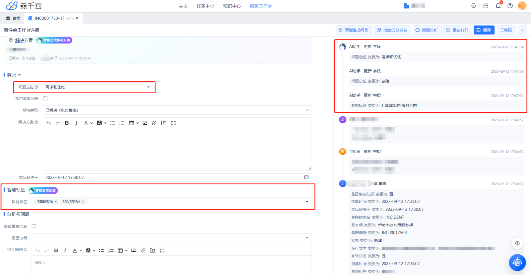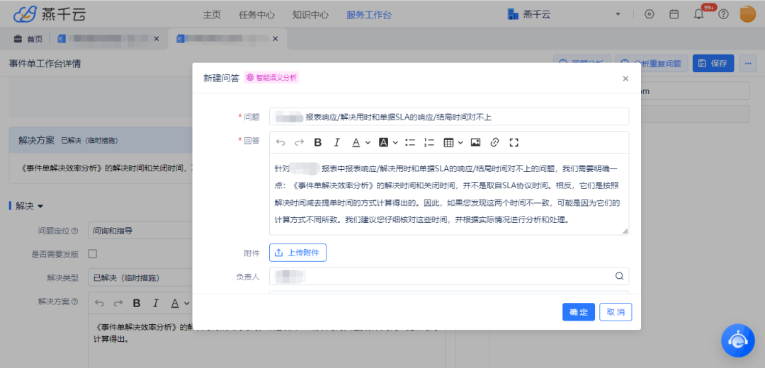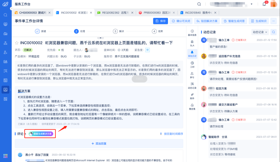 燕千云服务工作台提供工单的一站式服务解决过程管理,沟通过程、排查记录、SLA、工时、单据关系等一应俱全,通过汉得AIGC中台对服务沟通记录一键归纳解决方案,让服务过程无比顺畅和高效。
