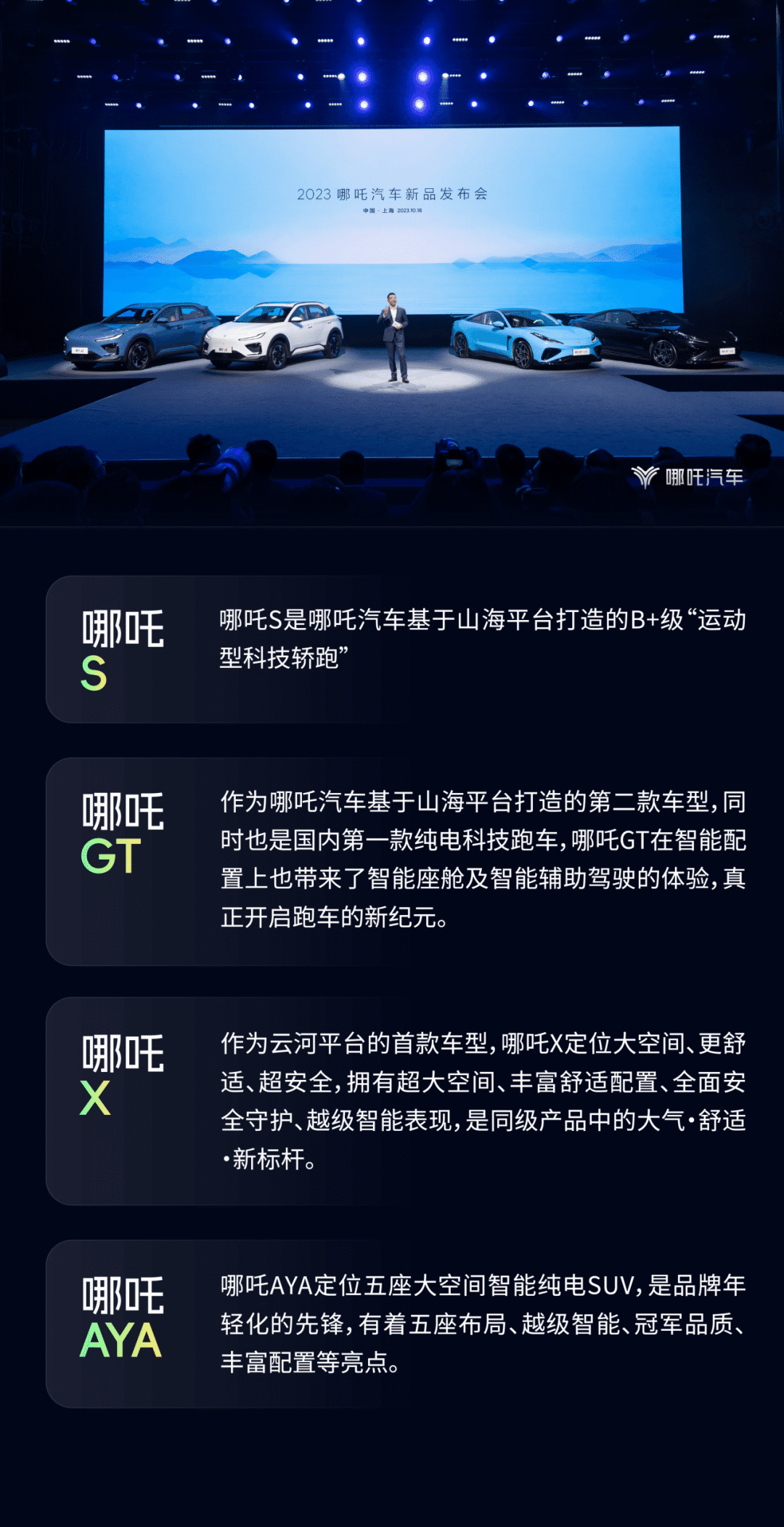 哪吒汽车聚焦大众消费市场,将基于精心打造的全新纯电动汽车专属平台,以每年一款新车的速度,推出多款不同级别的车型,覆盖A0-B级主流市场。目前,哪吒汽车已推出哪吒GT、哪吒S、哪吒U-Ⅱ、哪吒AYA、哪吒V等车型;哪吒汽车已发布全栈自研的智能安全汽车平台——“山海平台”、浩智技术品牌,以满足用户及市场的新需求,更好落地“科技平权”。