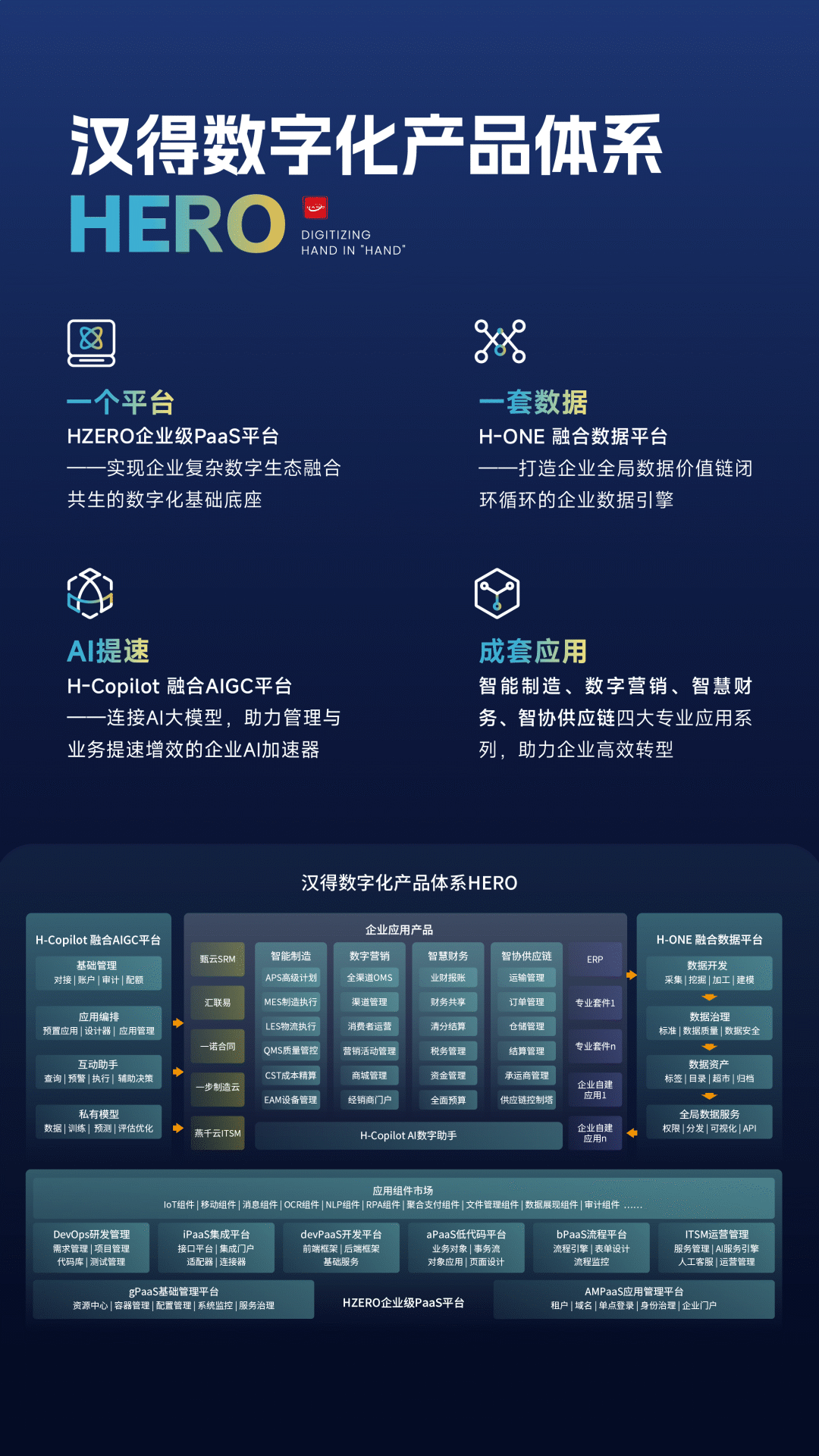 作为企业数字化综合服务商,汉得持续深耕自研,提升技术能力,坚持自主创新,并于今年正式发布汉得数字化产品体系HERO,其核心产品包括汉得HZERO企业级PaaS平台、H-Copilot融合AIGC平台、H-ONE融合数据平台,以及四大专业应用系列,进一步形成平台+工具+应用的产品组合,助力企业高效迈入“数字化转型2.0”。