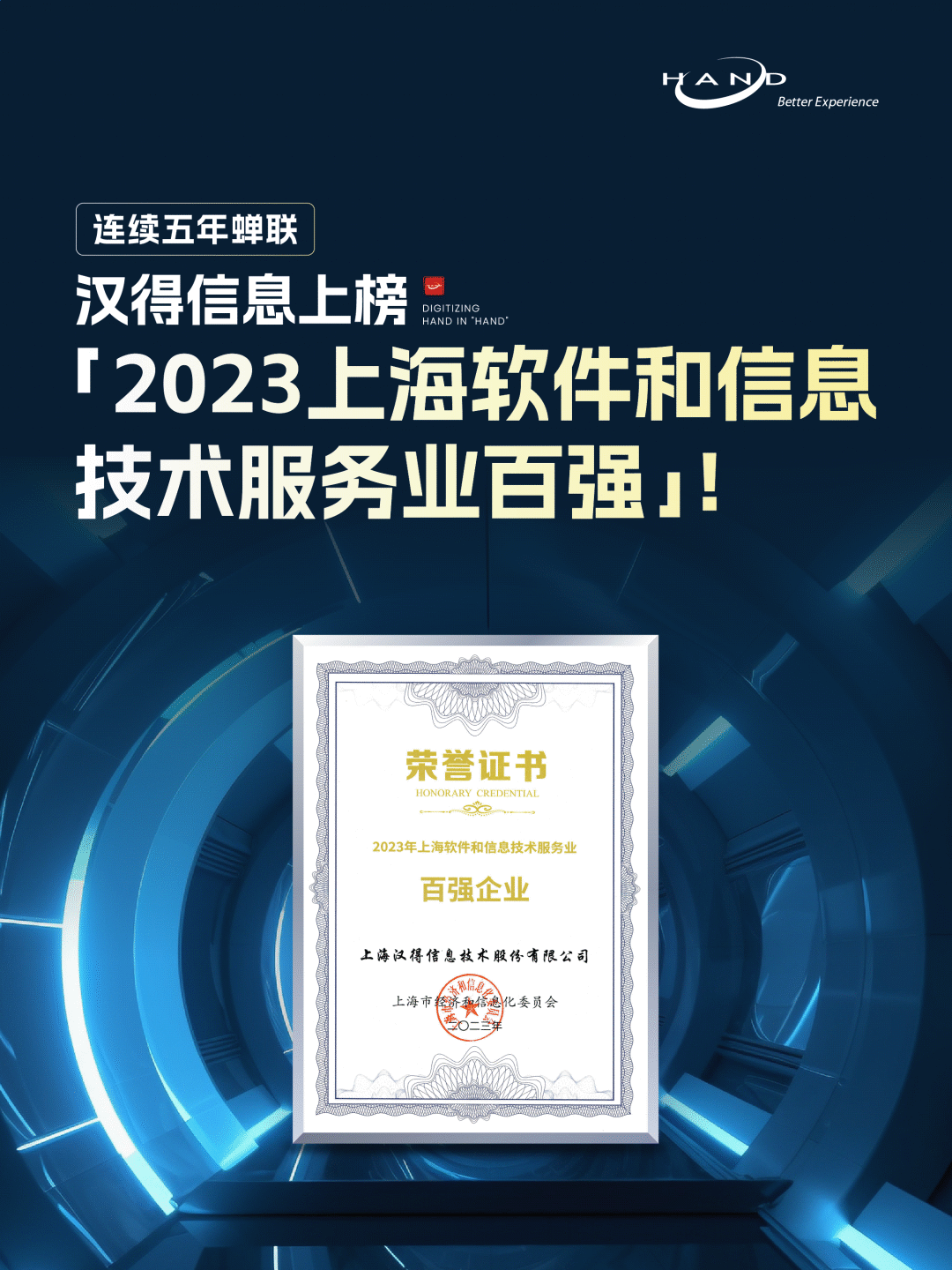 近日,上海市经济和信息化委员会正式公布“2023上海软件和信息技术服务业百强”名单(以下简称“百强”)。汉得信息凭借行业领先的市场服务规模、持续提升的核心竞争力和增长速度等突出表现,连续五年蝉联“百强”企业称号。2023上海软件和信息技术服务业百强该榜单在上海市软件行业协会和各区软件和信息服务业主管部门推荐的基础上,根据企业2020-2022年经营收入情况,按照年度经营收入规模和增长速度进行排名。据悉,该榜单自2018年开始每年发布,旨在推动上海市软件和信息技术服务业高质量发展,进一步促进企业做大做强,发挥骨干企业的引领作用。同时该榜单积极发挥重要示范带动作用,取得广泛社会影响,成为评价上海软信企业发展质量的重要指标参考。随着数字化转型深度推进、信息基础设施加快发展,企业的数字化能力已成为核心驱动力,各行各业的应用场景也正在加速与人工智能、云平台等数字技术进行深度融合。汉得有幸陪伴众多优秀的客户经历了长期的数字化建设,也见证了这当中各行业各领域冠军企业们的卓越实践,我们以此为积累不断沉淀打磨迭代,提升着我们对领先数字化建设方法的认知。作为企业数字化综合服务商,汉得持续深耕自研,提升技术能力,坚持自主创新,并于今年正式发布汉得数字化产品体系HERO,其核心产品包括汉得HZERO企业级PaaS平台、H-Copilot融合AIGC平台、H-ONE融合数据平台,以及四大专业应用系列,进一步形成平台+工具+应用的产品组合,助力企业高效迈入“数字化转型2.0”。连续五年上榜“2023上海软件和信息技术服务业百强”,是对汉得的充分肯定,同时也激励着汉得不断完善各应用产品,基于汉得HZERO打造企业技术底座,融合汉得H-ONE提供企业数据引擎,通过AIGC持续赋能企业,实现更多的应用场景落地,全面推动数字化转型升级。为行业提供卓越的产品方案,为推动数字经济创新发展,为进一步提高软件和信息技术服务业的价值创造力贡献汉得力量!数字化,放心交给我!