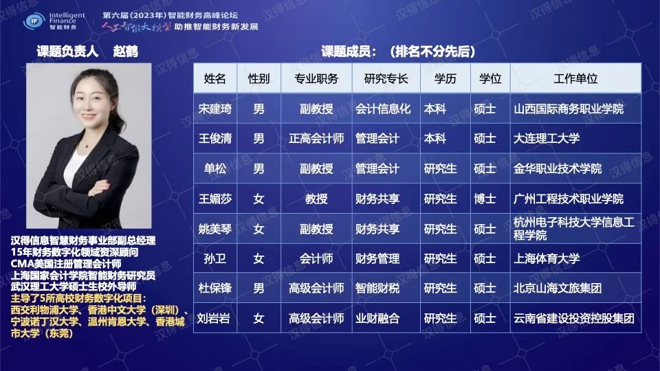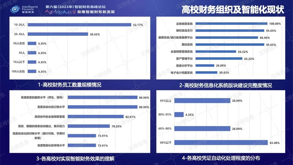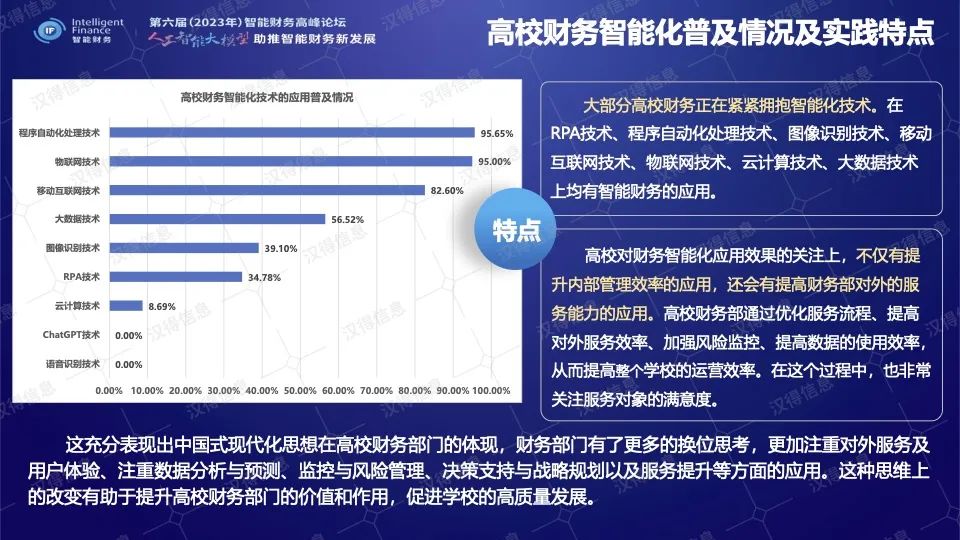 HAND VISION 高质量发展中的高等院校 智能财务体系建设研究 01 研究背景 高等院校作为培养国家基础研究人才的主力军和攻关“卡脖子”关键核心技术的国家队,肩负着重要责任!近几年,高校也在不断地通过科研、教学、管理等方面变革,实现高质量发展。 全面数字化、智能化校园建设是高校高质量发展的基石,很多高校已经从教学、科研、后勤、人事、财务等领域全面发力。财务智能化作为高校高质量发展的重要发力点之一,其效果直接影响学校科研经费的使用效率、师生的工作效率,进而对高校高质量发展产生深远影响。 人工智能新技术为重塑高等院校财务管理工作打开了巨大的想象空间。然而,针对高等院校智能财务体系建设的研究还相对较少。目前,国内外已有一些研究探讨智能技术在财务管理中的应用,但尚未有系统性地研究关注高等院校智能财务体系的构建和实践应用。 02 高校财务组织及智能化现状 汉得联合多位高校财务教授、智能财务实践专家们组成课题研究小组,经过一个半月的问卷调研,以及深入的实地访谈,收集了全国23所高校的智能财务建设情况。 ▲ 高校财务组织及智能化现状 基于广泛的案例研究分析,结合企业已经应用成熟的智能财务技术应用场景,整理出了财务体系与周边业务系统交互的主要数据。 结合数据不难发现,大部分高校财务正在紧紧拥抱智能化技术! 大部分高校在RPA技术、程序自动化处理技术、图像识别技术移动互联网技术、物联网技术、云计算技术、大数据技术上均有智能财务的应用。 ▲ 高校财务智能化普及情况及实践特点 同时我们会发现,高校对财务智能化应用效果的关注上,不仅有提升内部管理效率的应用,还重视提高财务部对外的服务能力的应用。 高校财务部通过优化服务流程、提高对外服务效率、加强风险监控、提高数据的使用效率,从而提高整个学校的运营效率,同时在这个过程中,也非常关注服务对象的满意度。 这充分表现出中国式现代化思想在高校财务部门的体现,财务部门有了更多的换位思考,更加注重对外服务及用户体验、注重数据分析与预测、监控与风险管理、决策支持与战略规划以及服务提升等方面的应用。这种思维上的改变有助于提升高校财务部门的价值和作用,促进学校的高质量发展。 03 “16847”财务智能化模型 研究小组按照新发展格局要求再造财务组织架构与管理流程,设计出适应高校战略发展需求的新型财务管理体系,创新性的提出了“中国式现代化高质量发展中的高等院校智能财务体系架构”——“16847”财务智能化模型,为高等学院的财务管理提供了新思路和新方法! ▲ 16847财务智能化模型 “16847”财务智能化模型,致力于通过数字化技术通过数字化技术和数据驱动的方法,提高财务管理的效率、降低财务风险、增加财务组织弹性并强化财务在学校决策中支持能力,助力高校高质量发展! ▲ 汉得在高校智能财务领域的服务能力 未来,汉得智慧财务团队将持续深入探讨如何更好地通过智能化技术,提升高校财务管理工作的效率和质量,结合汉得在高校智能财务建设中的实践经验,为高等院校的高质量发展提供更好的支撑和保障! 数字化,放心交给我!