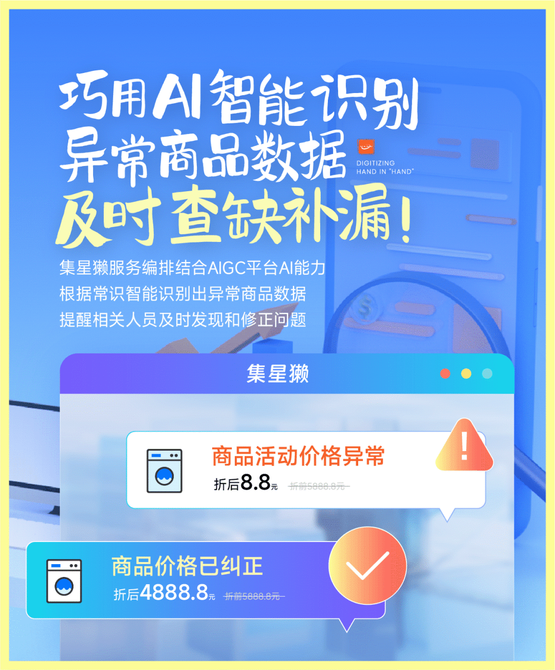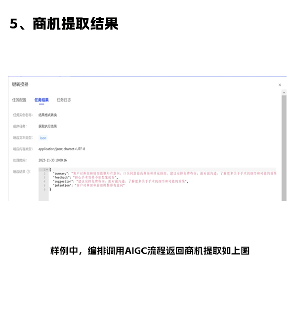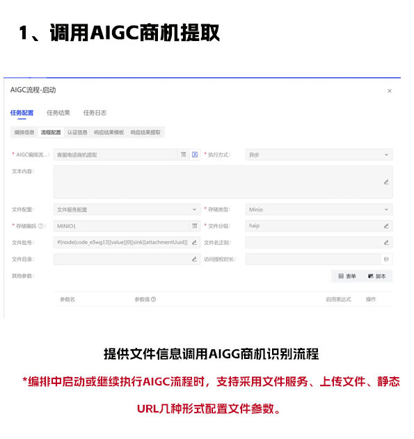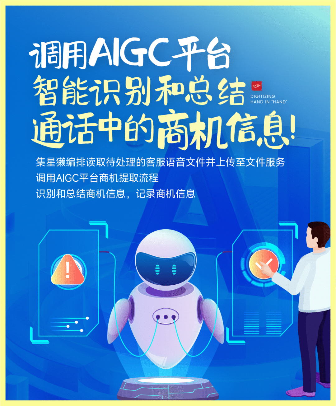 “ 全面对接AIGC平台 提供智能化服务能力 满足多种复杂的业务场景 集星獭产品服务编排模块 现已全面对接 汉得大圣融合AIGC平台 通过充分挖掘和利用AIGC的强大能力 带您深度体验落地集成AIGC应用场景 将AIGC平台的核心能力封装为编排节点,能够为企业提供更智能化的服务编排能力。 其中,AIGC对话问答、AIGC语音转换、AIGC知识库问答等基础节点,只需简单传参调用即可使用该AI能力。 AIGC编排流程节点则专门用于对接AIGC平台编排流程,以满足一些相对复杂的业务场景。AIGC编排流程,也是通过若干基础节点组合来完成一些智能化业务流程。 帮助企业充分挖掘和利用 AIGC的强大能力 是集星獭当前的使命! 集成AIGC应用场景 01 商品价格异常识别 场景实现 注:本样例主要通过AIGC的智能识别能力,基于一般常识判断商品价格是否处理相对合理范围。 << 滑动了解流程详情 >> 02 客服电话商机识别 场景实现 注:本样例主要通过AIGC的语音转换、文本提炼、参数识别能力,来识别提炼出客服语音中的商机信息。仅做部分说明,和场景一类似节点,不做赘述。 << 滑动了解流程详情 >> 随着AI技术的发展 快速识别适合应用AI技术的 业务场景对企业至关重要 集星獭产品服务编排模块 与大圣融合AIGC平台深度对接 将AI引入系统集成领域 充分发挥AIGC平台的 智能处理能力和强大的应用潜力 有效辅助处理难以标准化的内容 推动企业数字化转型和智能化升级 提升集成领域的智能化和创新力 集星獭,为帮助企业提高效率、优化用户体验、创新业务模式、降低成本和提高决策准确性,推动数字化转型和智能化升级而生,欢迎大家与我们一起共创! 汉得企业级系统集成平台(中文名集星獭,英文名JeeStar),是一站式多系统集成、多云集成、多端集成、多协议集成、多设备集成、数据集成、页面集成的全域集成解决方案。 集成平台沉淀了汉得多年ToB项目实施的系统集成经验,在消除企业信息孤岛、数据孤立、打通多源多端的数据断链及混合云对接等场景中提供了高效便捷的功能及策略方案。 数字化,放心交给我。