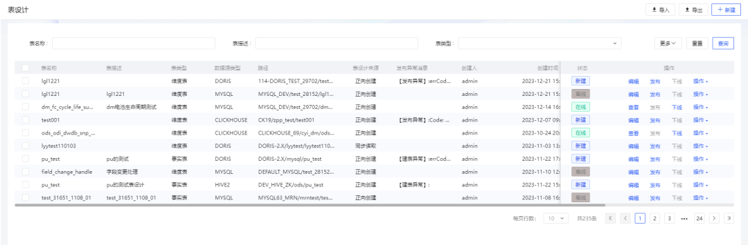数据架构优化完善,构建企业架构支柱。表设计数据源类型再扩展,支持doris、starrocks等数据源,支持分区表以及高级配置功能,满足各类表设计需求场景。同时支持导入导出,支持批量快速构建数据表。