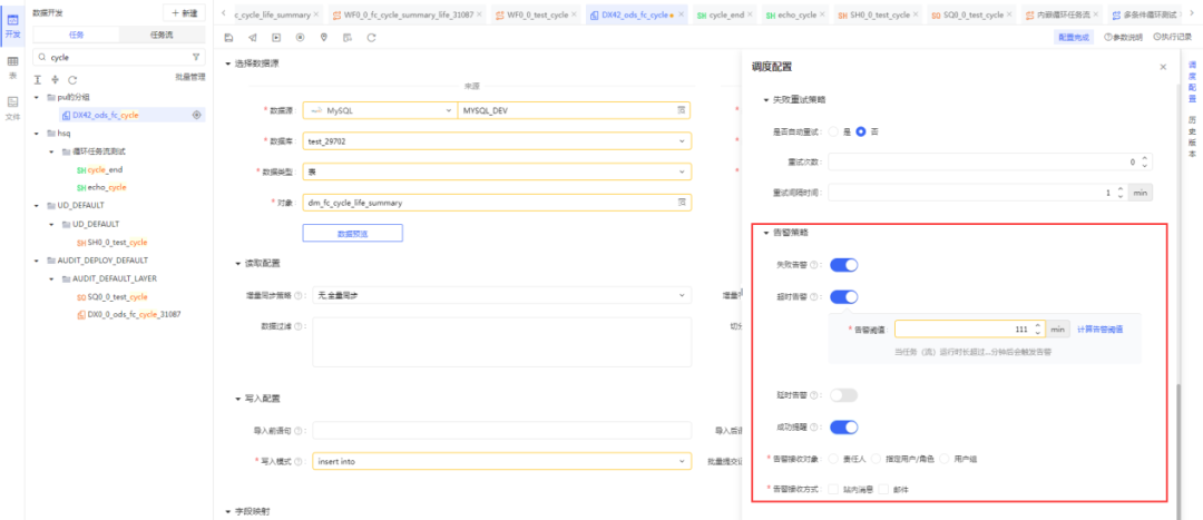 灵活调度配置,可视化告警配置,支持任务(流)的失败、超时、延时告警,提供多种通知方式,支持站内信、邮件等方式,提高消息的触达率。