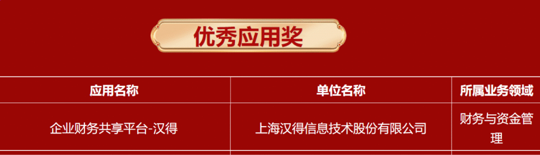 汉得企业财务共享平台历经初筛、初评及终评现场专家评审的层层评选,从476家企业762个参选应用中突出重围,摘得 “优秀应用奖” 。