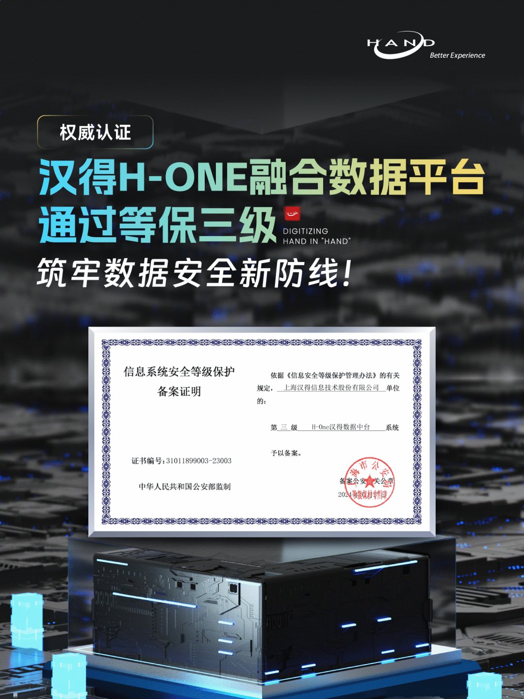 近日,汉得H-ONE融合数据平台历经6个月的材料准备、定级、备案等各项准备工作,顺利获得由国家公安部核准颁发的“信息系统安全等级保护三级认证”(以下简称“等保三级”)。