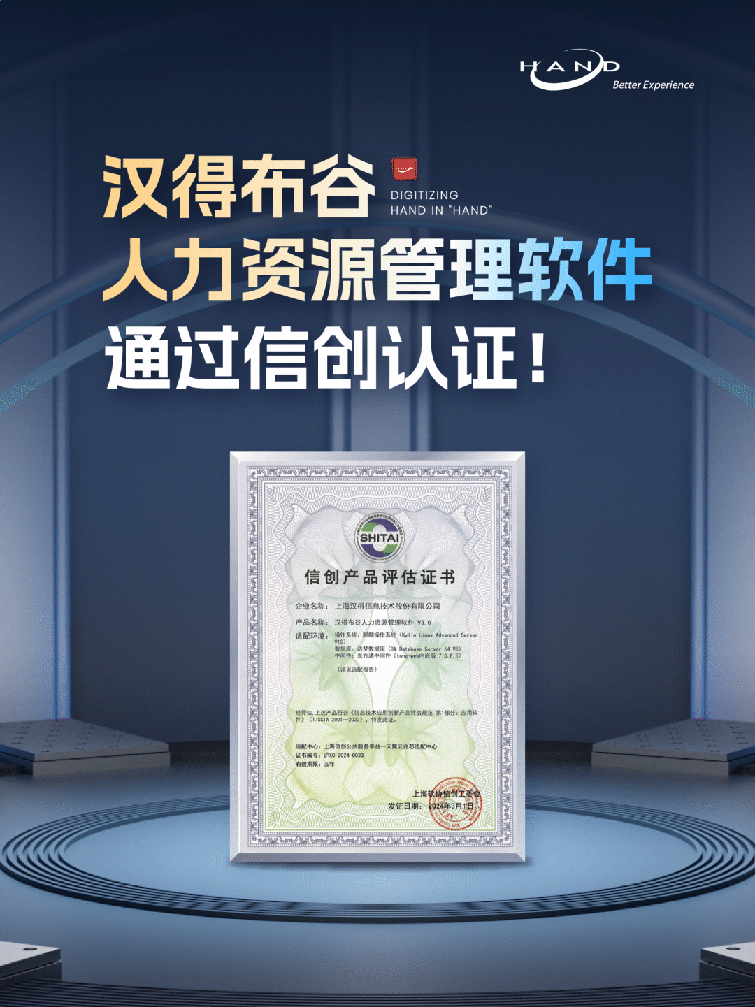 经过专家组严格评估,汉得布谷人力资源管理软件顺利通过信创测试认证,荣获由上海软件行业协会信创工作委员会颁发的“信创产品评估证书”,自此汉得布谷正式加入信创产品大家庭。