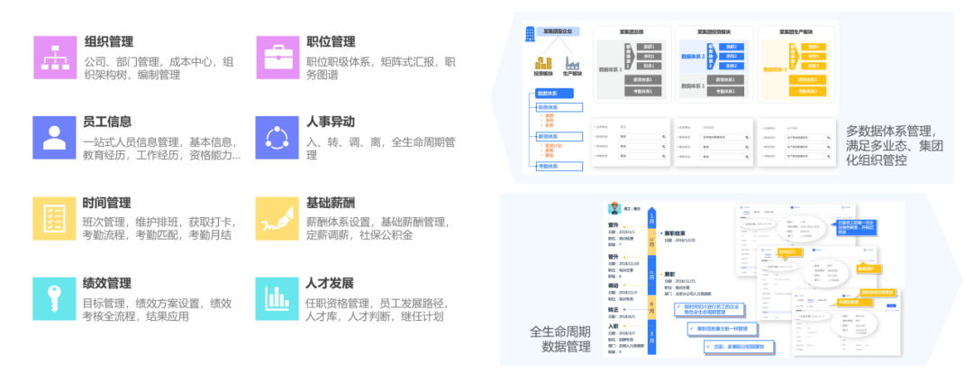 汉得布谷人力资源核心平台,包含组织管理、人员管理、基础薪酬管理、时间管理、绩效管理、人才管理等部分组成。强壮的平台支撑集团化体系的构建,高效的流程驱动员工全生命周期管理,历史数据完整可追溯,为企业打造一个强有力的数字化底座。