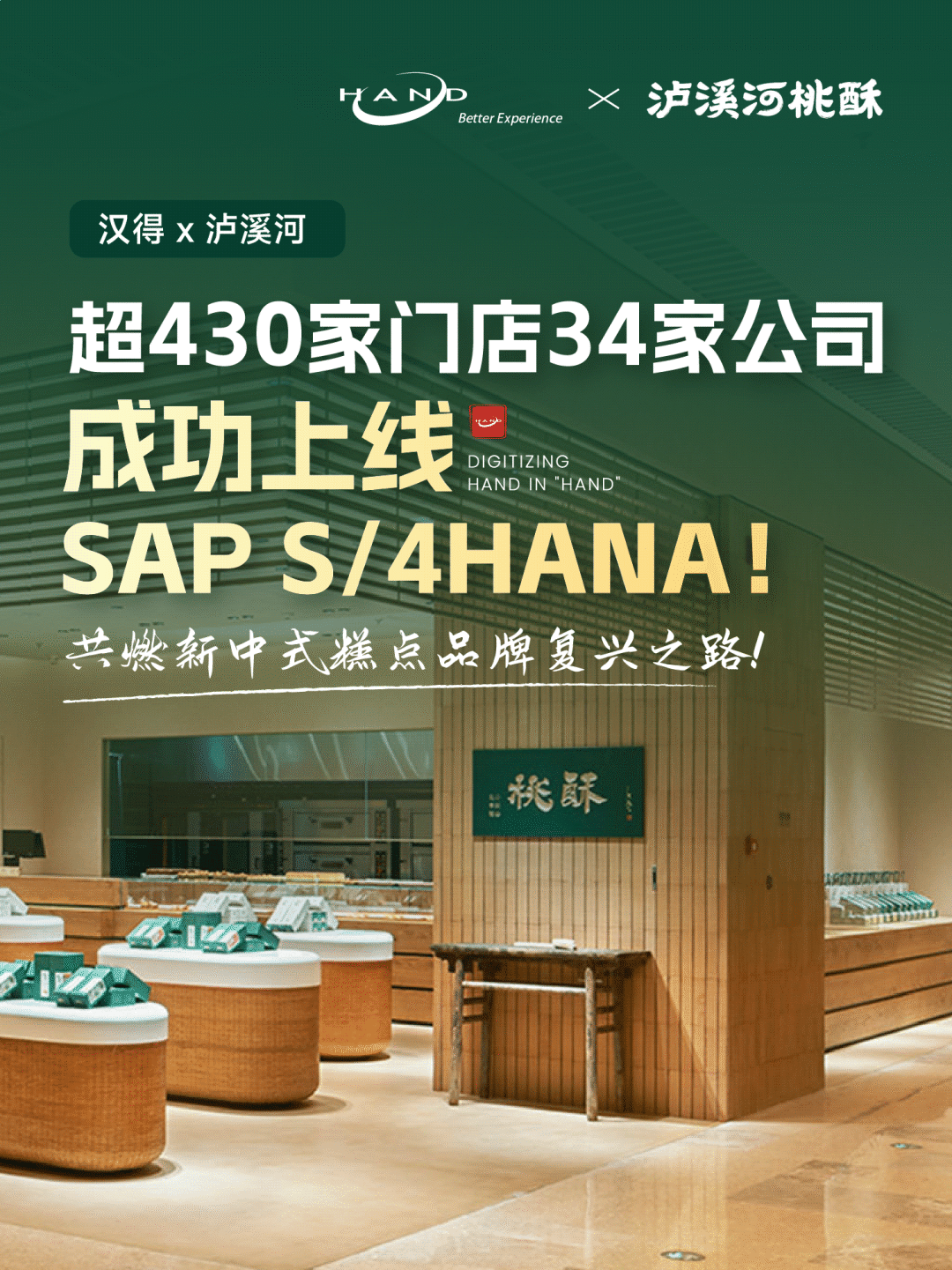 近期,泸溪河携手汉得成功上线 SAP S/4HANA 项目,并已顺利完成全国超430家门店34家公司的部署推广。通过此次合作,汉得为泸溪河全面打造数字化运营核心体系,成功搭建起以 SAP 为核心,支撑集团化管控、规模化扩张的企业级统一运营平台,将有效统筹管理集团层、中央工厂层、销售分公司层与门店子公司层级的各项业务流程,有力推动泸溪河数字化建设登上一个新的台阶!共燃新中式糕点品牌复兴之路汉得 x 泸溪河作为新中式点心领先品牌,泸溪河当前正处在高速发展阶段,然而企业所使用的系统已无法满足集团化、多公司和多业态的规模化的战略扩张目标。同时,随着泸溪河线下门店数量及业务量快速增长,急需构建起集团统一的主数据管理体系、实现业财一体化,才能支撑起泸溪河长期的数字化建设需求。在经过全面考察和深思熟虑后,泸溪河最终决定引入 SAP S/4HANA 系统,携手汉得共同打造数字化运营核心体系!在项目进行过程中,汉得团队为保证项目进度按计划推进,各业务部门间通力协作,在历经调研、蓝图规划设计、系统实施、试点及推广单位上线后期服务保障等多个阶段后,最终完成了超过430家门店业务的对接与运行,并确保 SAP 以及周边系统上线后均稳定运行。同时为了保证系统切换后泸溪河各门店及公司的月结和年结顺利,汉得顾问在项目后期不仅始终活跃在一线现场提供专业技术支持,还及时组织安排培训和交接工作,保证关键用户及内部顾问能够接手后续运维工作。此次泸溪河 SAP S/4HANA 项目共涉及公司34家,门店数超430家,周边系统接口及开发项200余项,自定义角色1000余个,门店月度要货数50+W;财务凭证数(年)达1500+W。项目的成功上线,不仅帮助泸溪河实现 ERP 系统与 OA、营运中台、对账中台等系统的业务和数据集成,确保集团的整个信息流实时、高效、准确地传递,还明确了会计核算规范,优化门店运营、门店制造、工厂计划、工厂生产控制和物流体系,提高整体管控水平,为公司的各项业务开展,提供强有力的数字化保障。作为国内领先的企业数字化综合服务商,汉得始终致力于成为连接企业管理与数字化技术的桥梁,不断提升交付质量与效率,努力为客户带来更好的数字化体验!携手汉得,成就强品牌梦想!