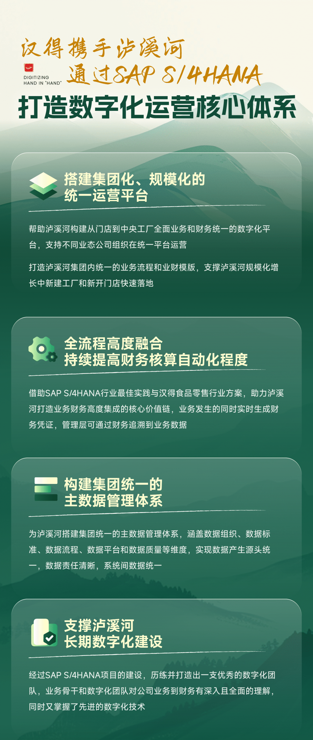 通过此次合作,汉得为泸溪河全面打造数字化运营核心体系,成功搭建起以 SAP 为核心,支撑集团化管控、规模化扩张的企业级统一运营平台,将有效统筹管理集团层、中央工厂层、销售分公司层与门店子公司层级的各项业务流程,有力推动泸溪河数字化建设登上一个新的台阶!