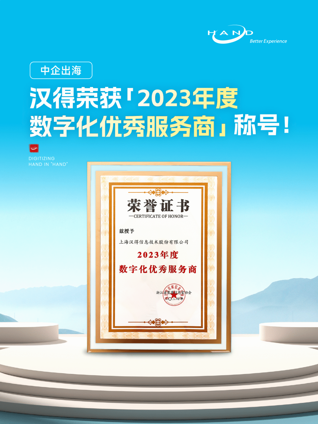 4月13日,以“数聚浙里 智领未来”为主题,由浙江省首席信息官协会主办的数字化转型与升级论坛暨CIO年度峰会于杭州隆重召开。汉得受邀参加本次峰会,在会上对中企出海整体服务能力与应用实践进行了全面展示,并凭借在企业数字化转型的专业实力,荣获“2023年度数字化优秀服务商”称号,汉得Oracle销售部总经理黄志强先生作为公司代表上台领奖!▲ 汉得Oracle销售部总经理黄志强先生(右二)作为公司代表上台领奖支撑企业全球化拓展为中企出海“把脉问诊”在本次峰会上,汉得围绕“数字化加速中企出海”这一行业议题,为中企出海“把脉问诊”,全面展示了自身在海外数字化应用架构、产销协同、本地化财税等多维度能力,另有汉得全球市场布局、全球一体化服务等多项能力重磅亮相。过去一年,凭借丰富的全球化企业海外系统方案与服务经验,汉得助力圣奥科技、霸王茶姬、浙江亚特、徐工集团、乐歌等众多中企加速迈向全球市场,广泛赋能各行各业,推动产业与数字技术深度融合,通过数字化转型提高企业出海业务的质量和效益,引领行业高质量发展。数字化驱动航海变革拥抱变化 扬帆远航在数字中国战略背景下,大会邀请相关政府部门领导、知名专家、行业技术精英、企业高管等数字化领袖人才齐聚,围绕“数字化转型升级”,共话数字技术发展新趋势、实践应用新场景、企业数字化转型新路径,共绘数字经济创新发展新图景。▲ 汉得企业出海战略方案总监蒋文一先生现场发表主题演讲汉得企业出海战略方案总监蒋文一先生受邀发表主题演讲《数字化驱动航海变革:拥抱变化,扬帆远航》。他提到,在中企出海过程中面临业务多样性、供应链效率、多区域扩张、本地化能力等众多挑战,需要企业借助数字化打通堵点,实现对市场的敏捷反应。围绕中企出海数字化变革的关键要素,汉得经过多年来不断打磨、迭代、优化,形成了体系化的出海服务能力组合,可满足中企出海的多样化需求。目前,汉得中企出海服务已经覆盖海外系统平台建设、管理系统建设,并为业务协同平台、数字化运营、海外并购、数据合规、数据基础设施等提供重要支持,既服务中企总部建设全球化业务平台体系的目标,同时支持其具体海外业务从开拓到稳定发展的全周期需求。与此同时,汉得在长期服务中企出海中,还敏锐地发现企业日益深入的本地化需求。对此,汉得不断拓展服务区域、提升本地专业团队能力与规模,已在全球主要大洲设立独立的一级/二级子公司,覆盖北美、欧洲、日本、东南亚多个区域,具备提供覆盖全球数字化服务的能力。目前,我国企业正积极出海布局新业态,在跨境电商、丝路电商、跨境物流、短视频、游戏等新业态领域的“出海故事”正不断更新。汉得致力于成为企业管理与数字化技术的桥梁,应对新场景,满足新需求,促进数字经济与中国企业高质量出海深度融合,持续提供优质的出海服务解决方案。携手汉得,成就强品牌梦想!