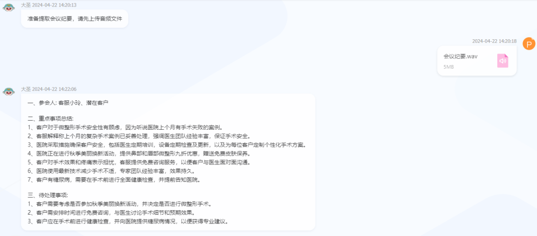 用户能够便捷地将包括音频文件、图片文件、Word文档等在内的各类文件直接发送给AI助手。AI助手能够将这些文件内容高效地转换为文字,并进而生成简明扼要的总结,同时提炼出文档中的关键要点,分点陈列,使得用户可以更加清晰直观地理解内容。除此之外,用户还能根据个人需求,指定AI助手以特定格式呈现总结内容,实现个性化定制。