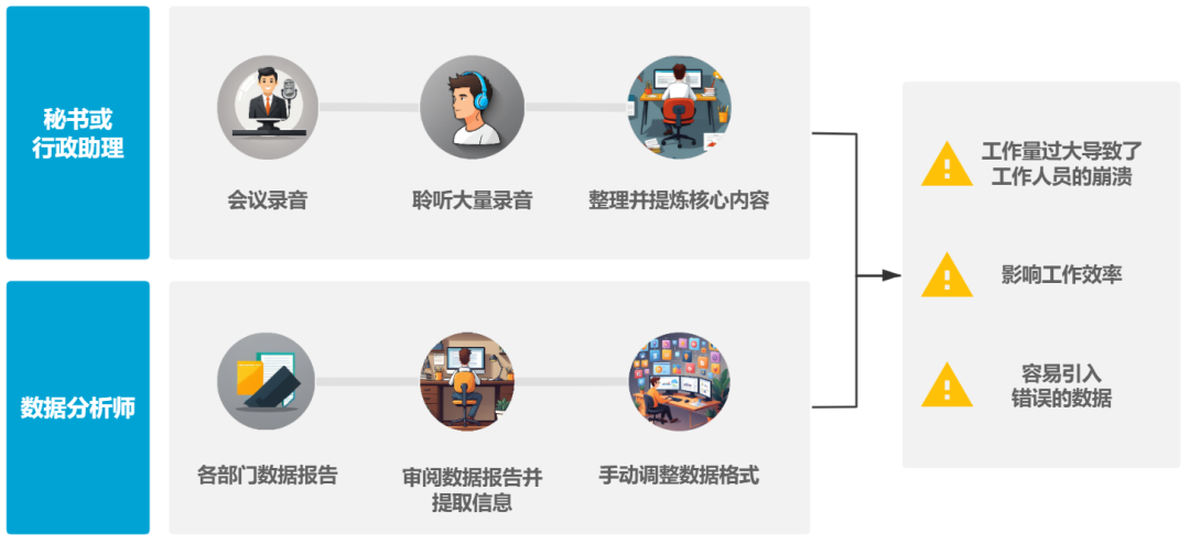 然而,这些看似常规的工作背后,实则蕴藏着巨大的繁琐与易错风险。想象一下,一字一句地聆听录音并整理会议内容,稍有疏忽就可能遗漏关键讨论点;而在审阅数据报告时,由于每个报告的格式和指标各异,数据分析师们需要手动调整每个报告的数据格式,确保数据类型的一致性,再进行整合分析。数据的繁杂性常常导致错误的引入。