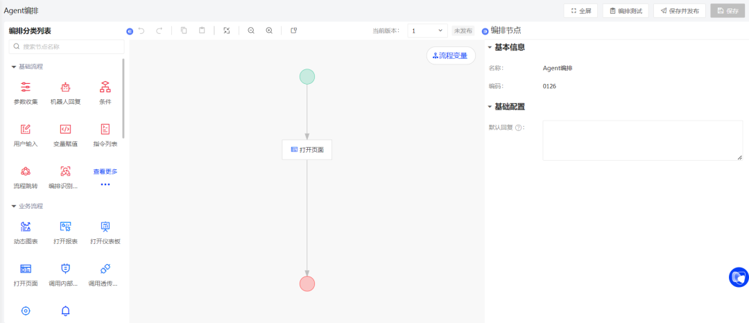 打开页面节点支持打开内部页面或外部页面,并支持维护页面的打开方式和页面参数。