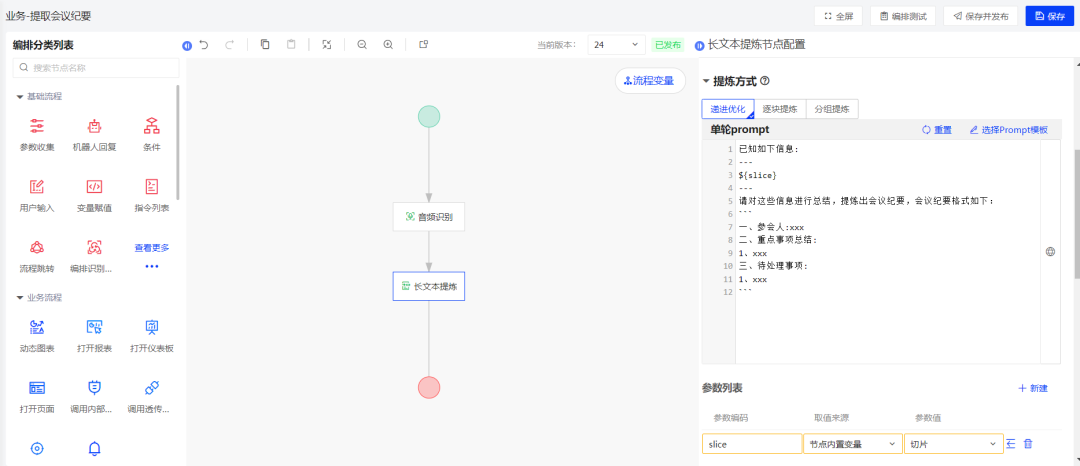 长文本提炼节点巧妙运用大模型技术,能够将文件内容进行提炼总结,同时为优化提炼效果,支持“递进优化”、“逐块提炼”、“分组提炼”三种提炼方式。