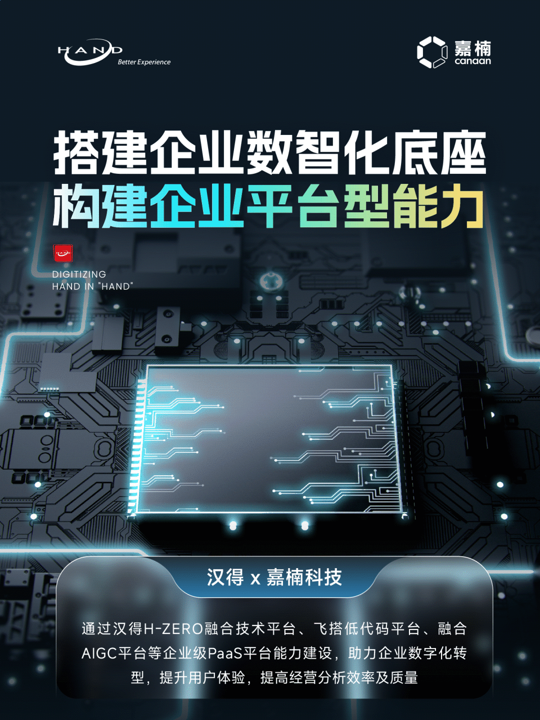 本次项目通过汉得H-ZERO融合技术平台,搭载飞搭低代码平台、融合AIGC平台等企业级PaaS平台能力建设,将为嘉楠科技提供全方位的IT支持和数字化解决方案。