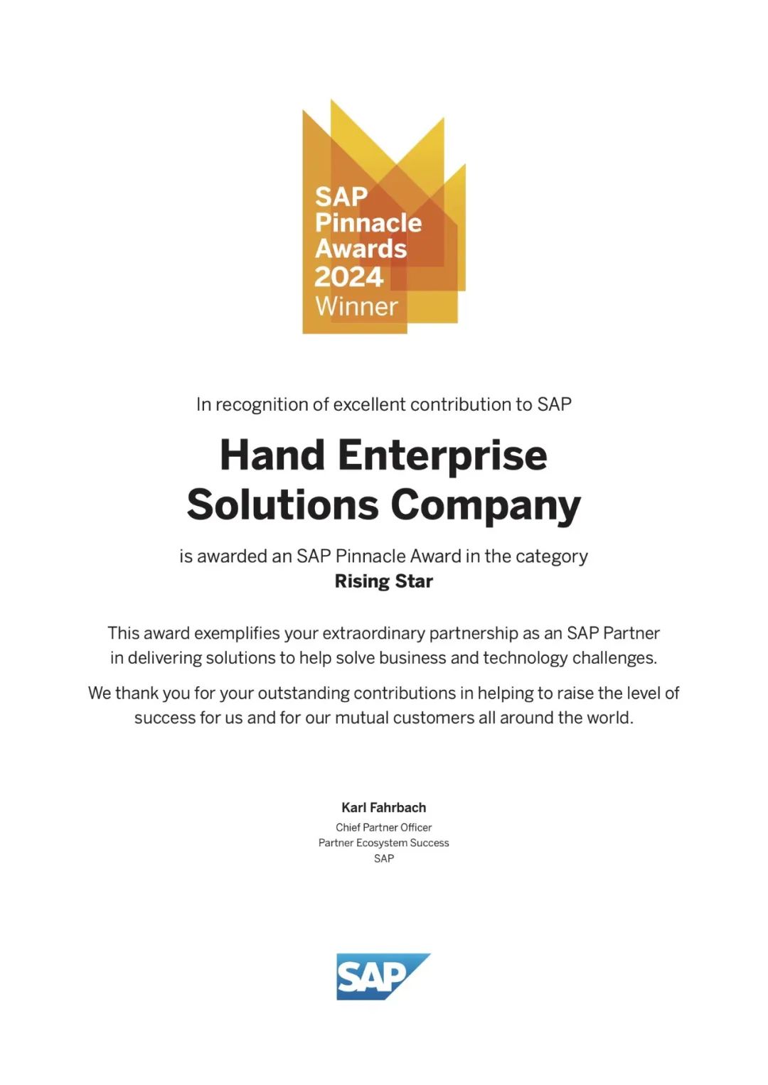 此次获得 2024 SAP Pinnacle Awards Rising Star 奖项,证明了汉得有能力在 SAP 企业应用软件解决方案平台之上,深度理解客户的业务需求,交付优异的服务价值,提供化繁为简的解决方案,并帮助客户成为卓越运营的企业。