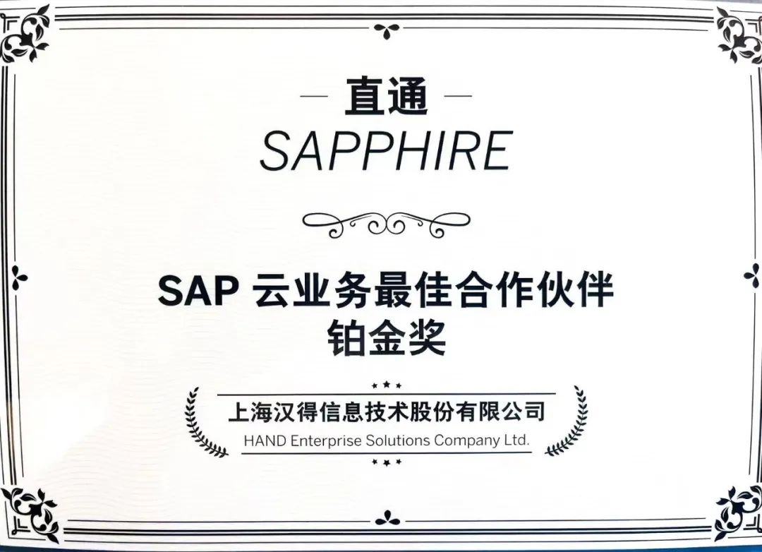 此外,汉得还获得了由 SAP 全球执行副总裁、大中华区总裁黄陈宏博士颁发的 SAP 云业务最佳合作伙伴铂金奖!