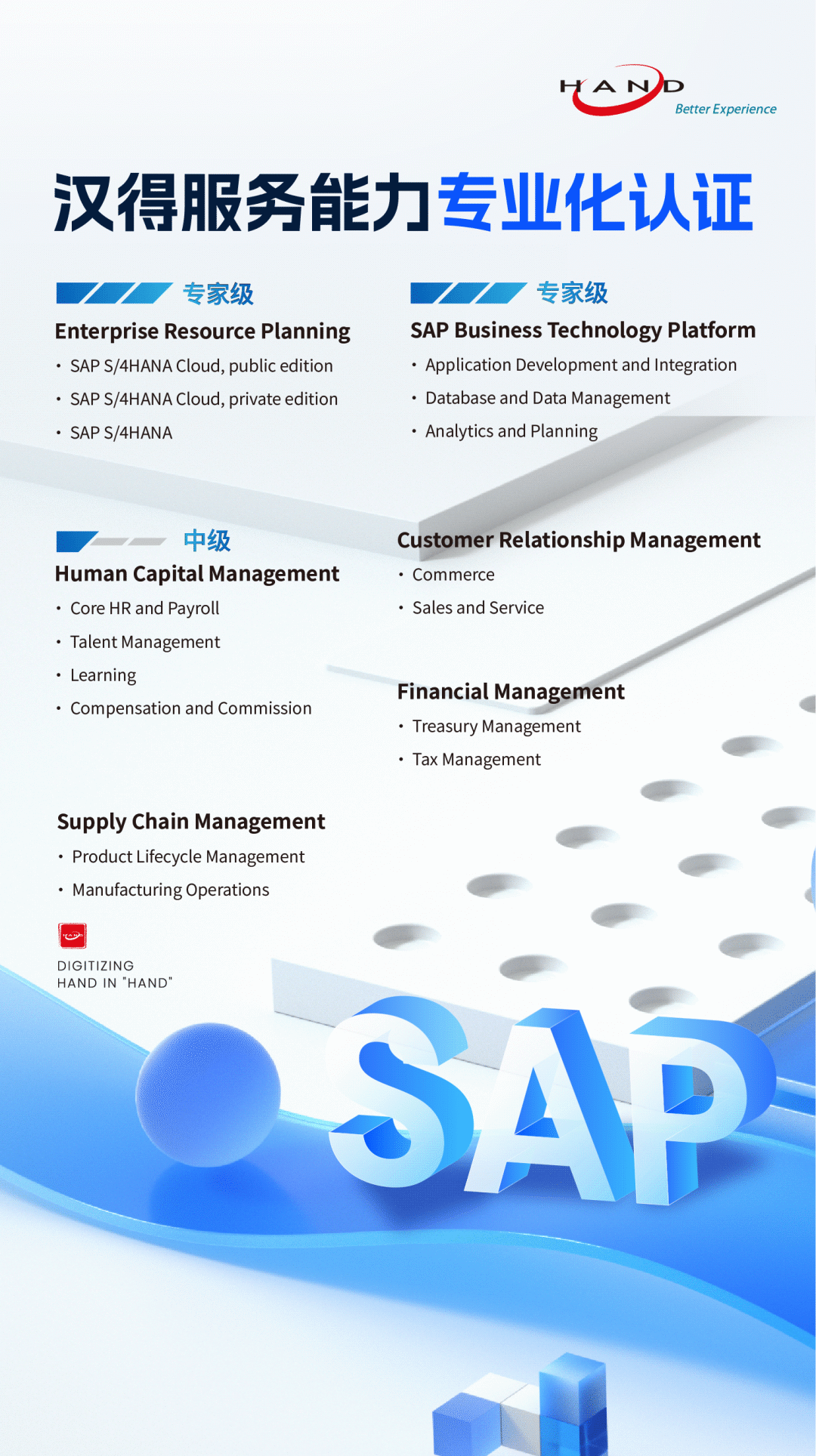 汉得作为在中国早一批实施SAP管理软件的中国本土服务公司之一,于1997年其前身就已成为SAP在中国的认证合作伙伴。经过二十余年的积累和沉淀,目前汉得已建立起完善的自有的人员培养体系,为行业培养及输送了大量优秀的 SAP 咨询顾问,并成功地为数千家中外企业落地部署了 SAP 系列产品,客户覆盖大型设备制造、机械制造、快消、食品零售、服装鞋帽、高科技、家用电器、化工、医药、房地产、公共事业、整车及汽车配件等行业。