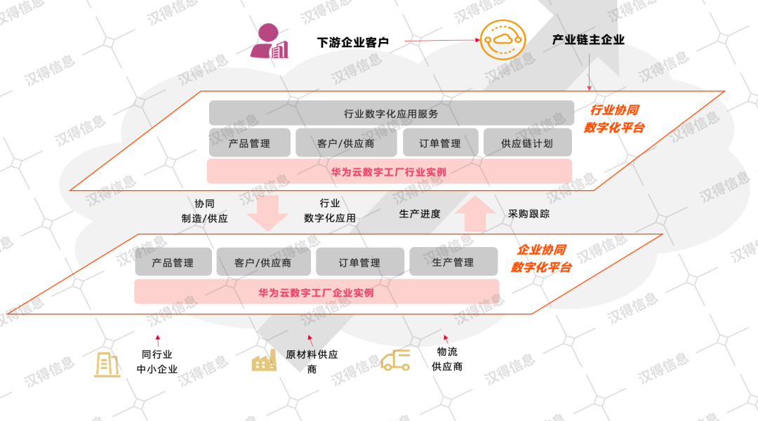 利用华为云数字工厂的两级平台架构,汉得构建了“行业+企业”的数字化协同管理平台,不仅打通产业链上下游企业的产供销数据,加速上下游企业信息协同效率,也驱动整个供应链/产业链实现数字化运营与资源共享。