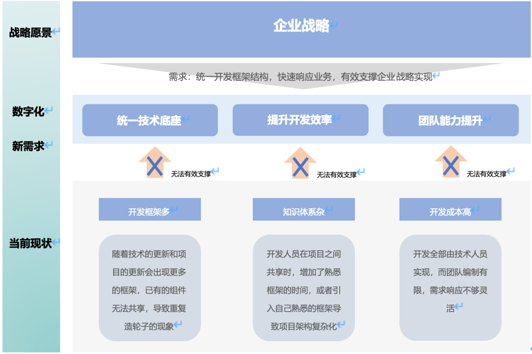 信息中心从过去的业务支持者转变为业务合作伙伴,重点在于为业务提供赋能支持。在这一过程中,企业自主开发项目逐渐增多,但同时也面临着技术框架和能力不统一,以及开发平台低效等挑战,这些问题开始逐步影响到数字化进程的推进。