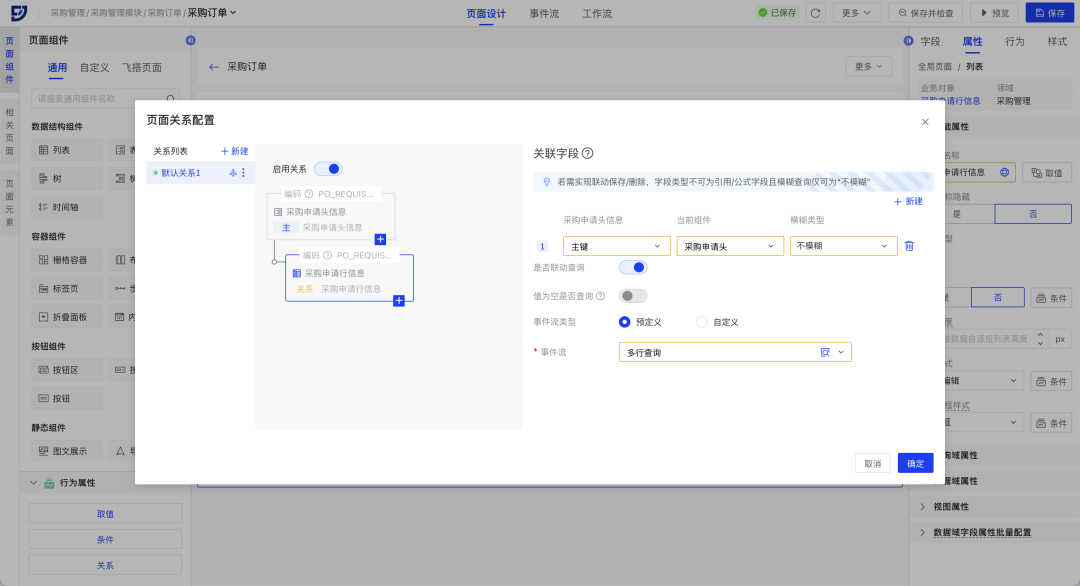 所以在业务实现中,相同的业务信息往往在多个单据呈现。传统开发需在单据页面重复开发,而飞搭低代码为提高用户效率,新增配置预设页面,在对象数据源维度设计基础页面,后续关联的单据页面设计均能够直接使用。