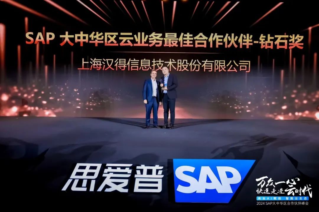 会上,汉得荣获由 SAP 全球首席合作伙伴官 Karl Fahrbach 先生颁发的 SAP 大中华区云业务最佳合作伙伴钻石奖,汉得 SAP 业务总经理徐云磊先生代表汉得上台领奖。本次获奖不仅是对汉得卓越服务能力的认可,也彰显了汉得与 SAP 合作过程中在云业务拓展与创新等方面的杰出贡献。