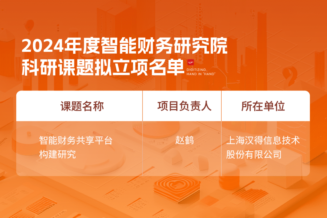 近日,汉得成功申报智能财务研究院(以下简称“研究院”)2024年度科研课题,入选“2024年度智能财务研究院科研课题拟立项名单”,申报课题为《智能财务共享平台构建研究》。