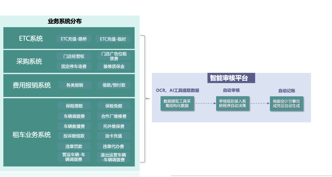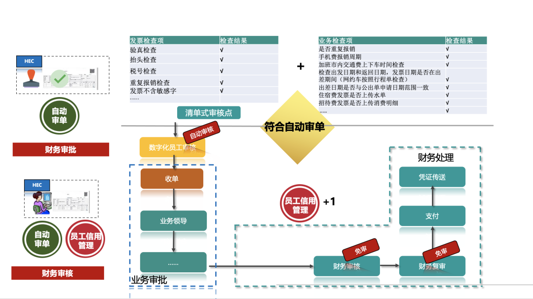 于是该企业选择携手汉得,共同搭建智能审核平台,将所有需要财务审核的系统业务全部梳理出来,由系统自动进行预检、审核;面对复杂场景或警告业务转人工后,以清单的形式让人工逐条检查,避免错漏审。