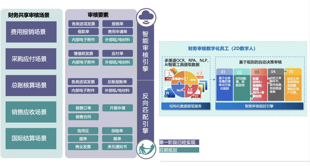 该央企从最早的费用报销场景开始试点,取得成效后又将业务逐步覆盖至采购应付、总账核算、销售应收、国际结算等场景。同时为了取得更好的智能审核效果,还引入了具备多个专业识别渠道的识别平台,满足自主切换或并行使用。