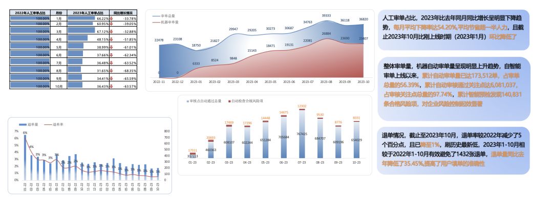 该系统上线10个月,智能预检累计发现622万条合规风险项;流程退单从6%下降至1%,有效避免7200+张财务退单;纳入财务审核的组织增加,月审单总量从1w单上升到3w单,审核人员未增加。