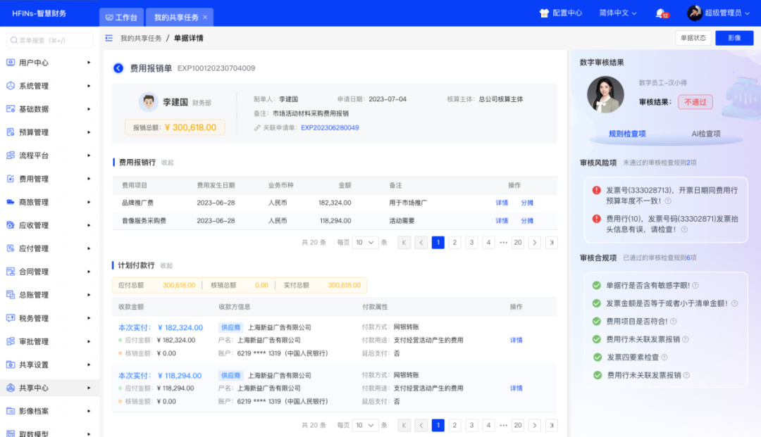 2021年,该公司又开始尝试将财务审单要点交给专业系统完成智能预检,在发票采集、单据提交环节中负责进行检查,当面对复杂场景或警告项时再转人工审核。