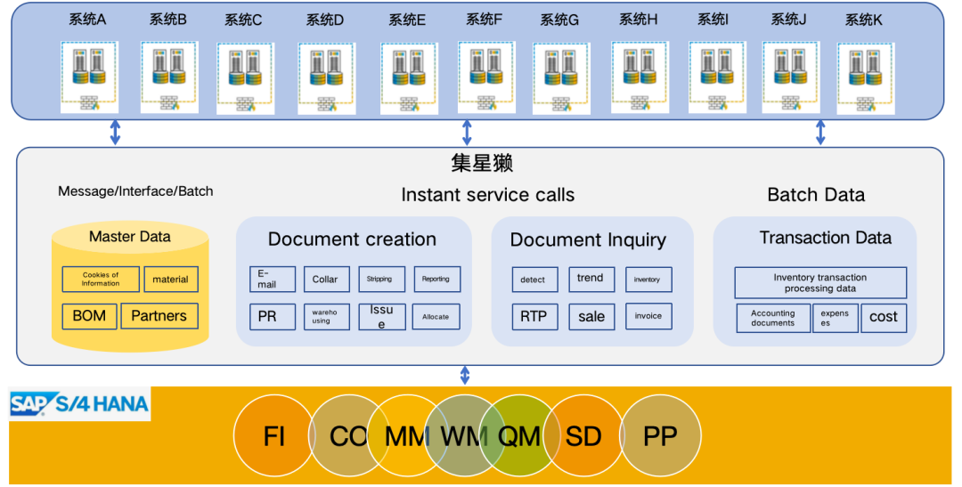 在汉得方案中,以 H-ZERO iPaaS 集成平台-集星獭构建企业服务总线平台,实现 SAP 及本地部署系统的单据创建、查询和批量数据交互。