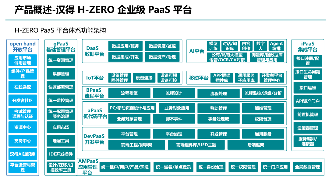 汉得 H-ZERO PaaS 平台是一套功能全面的技术体系,专为满足大企业的严苛需求而设计。该平台提供高、低代码双引擎、多组件开发、流程管理、集成、基础架构和应用管理、AI 应用等多项能力,并配备丰富的效率工具和知识支持体系。经过多年来在1000多个中大型客户项目中的实际应用,其高效性和可靠性得到了充分验证。