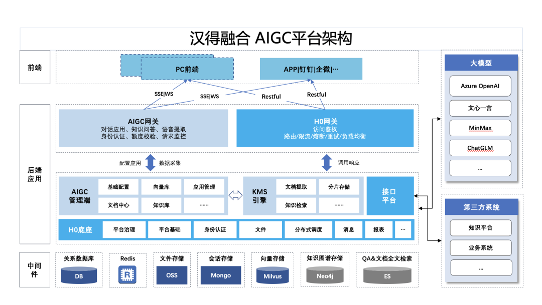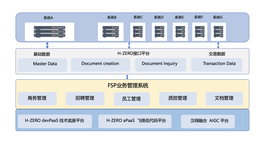 本次项目由汉得大客户数字化平台事业部交付,在对项目需求进行全面评估后,项目组决定以汉得 H-ZERO 企业级 PaaS 平台为基底,辅以汉得低代码平台-飞搭、汉得融合 AIGC 平台-大圣进行系统构建。
