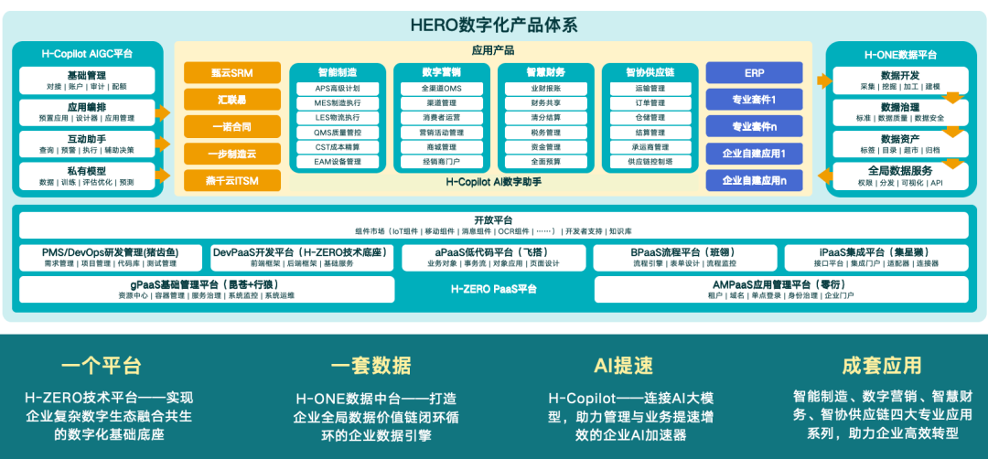 汉得数字化产品体系HERO,核心包括汉得H-ZERO企业级PaaS平台、AI中台、H-ONE融合数据平台,以及四大专业应用系列,助力企业高效迈入“数字化转型2.0”