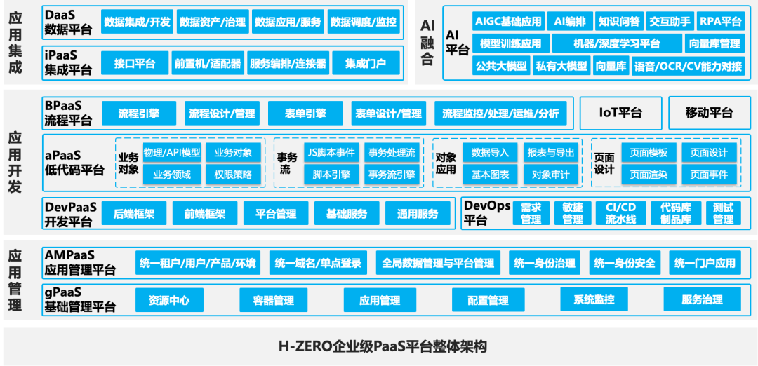 构建高效的高低代码开发体系,包括 DevPaaS 开发平台、aPaaS 低代码平台、bPaaS 流程平台等。这些平台通过有效结合,提供大量的开箱即用能力,能够极大地加速企业应用构建速度和降低开发成本。