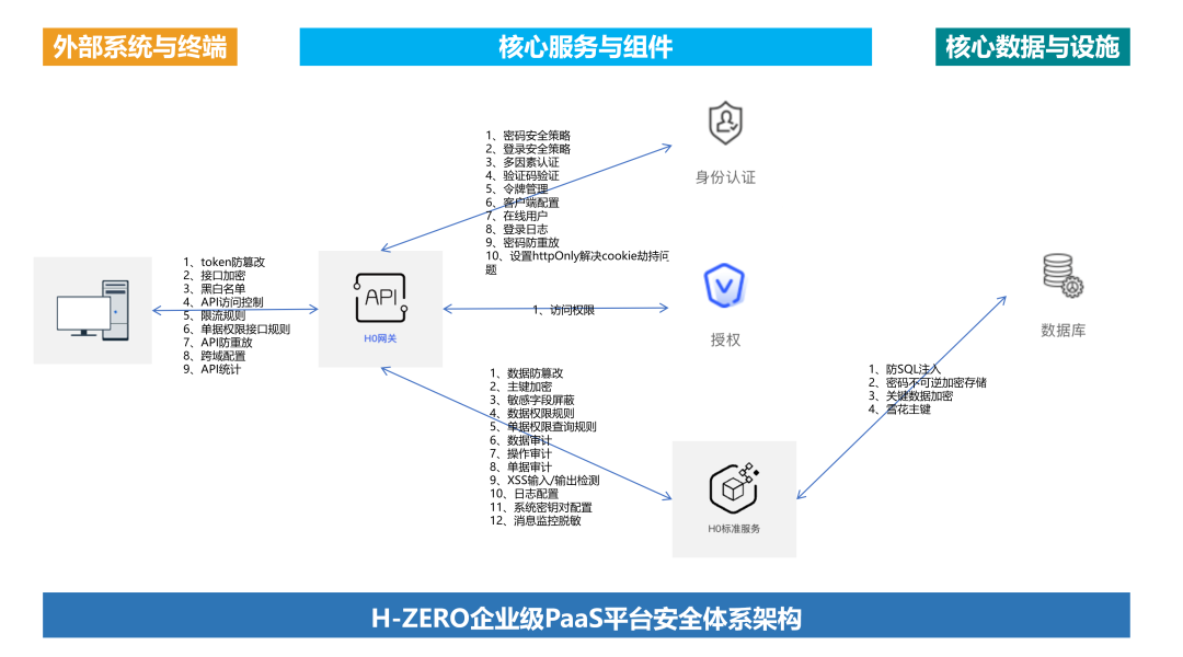 汉得 H-ZERO 安全体系架构,通过精心设计的三个关键层级:外部系统与终端、核心服务与组件、核心数据与设施,实现对企业数据和资产的全方位保护。