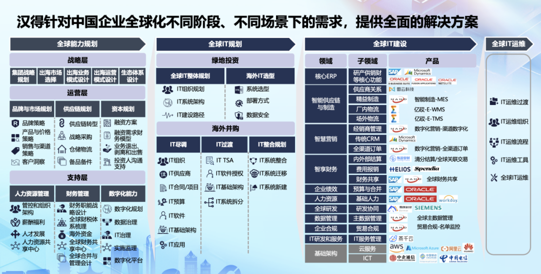 面对中国企业重新构建自上而下的全球化战略,汉得能够通过分层的数字化平台支撑全球化能力构建,以业务规划、数字化设计、项目落地打造中企全球化“全球交付模型”助力企业出海扬帆全球发展!