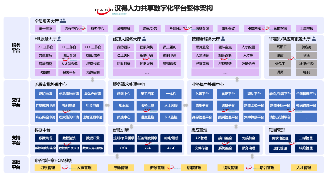 在支持平台层,以数字技术引领变革,通过融合跨界应用与创新,快速实现人力资源高科技服务。
