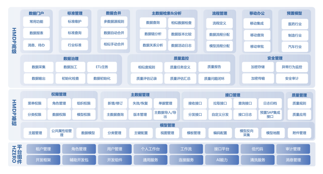 汉得主数据平台 HMDP ,是基于 H-ZERO 微服务架构平台,由多个应用组件通力构成,是一款面向企业灵活的、全面的、智能的综合主数据管理平台。