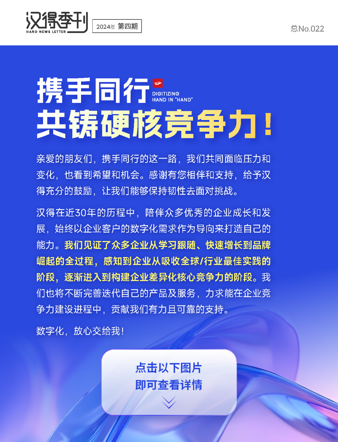 #01共筑企业技术底座汉得H-ZERO PaaS平台点击图片,查看详情咸亨国际将实现企业内部流程和系统的深度整合与优化,构建灵活高效的数字化运营体系打造高效、智能的财务中台,为银川建发的持续发展提供强有力的支持为泰格医药的FSP业务构建统一的数智化底座,实现对CRO人才专业服务全流程的精细化线上管理与重构前相比,交付周期缩短30%,实施成本降低40%,益吉的QMS产品力更是迈向了新的台阶平台高效服务于业务需求,为麦格米特“加速海外布局、扩展海外市场”战略提供强有力的保障为盛虹石化产业集团构建涵盖多个细分业务场景的综合性数字化应用体系,为企业的未来发展提供强大支撑帮助环球晶圆成功引入汉得H-ZERO iPaaS集成平台-集星獭,实现SaaS版的SAP系统与其他系统的高效整合#02B端智能化场景落地汉得融合AIGC平台点击图片,查看详情当IT人在绞尽脑汁怎么让AI为业务部门创造价值时,却忽略了在IT建设领域里,AI就有很多价值2024年有越来越多的企业选择部署H-Copilot平台,开始构建自己的智能化目前在各个业务域累计近百个智能体应用研发完成,场景化落地,持续回馈给所有AI生态的企业用户汉得受邀参加《AI Native 技术与架构白皮书》联合编写和评审,参加“创原会数据库分会”成立仪式汉得联合火山引擎共创AI智能体,共同举办“AI时代共话数字化征程”主题活动亿砹E-TMS产品AIGC应用能力再次全面升级,引入智能体架构再造智能物流应用AIGC+ERP会如何增强软件效用,如何改变人与软件的链接关系,促进怎样的企业管理变革#03数据驱动变革汉得H-ONE融合数据平台点击图片,查看详情汉得持续完善在数据领域的全域优势,为“数智共生,数驱未来”持续贡献汉得力量凭借某新能源龙头厂商的数据开发治理一体化项目,成功入选该报告的最佳实践案例增强海亮集团的战略协同力,带来显著的经济效益和管理效率的提升,更在行业内树立起数据治理标杆#04携手同行共铸企业硬核竞争力点击图片,查看详情直击中国企业碳管理痛点,与易碳数科携手为中国企业提供全面、合规、精准的碳管理数字化解决方案与开物信息共创“场景驱动+软硬一体+全链生态”新模式,探索矿山/物流产业数字化应用新领域助力奥马冰箱供应链计划体系的规划建设及APS数字化应用落地,提升奥马冰箱整体竞争力帮助潍柴动力打通供应商从注册到合格、从需求到采购、从预测到付款、从整改到索赔的全流程数字化断点帮助德赛西威进行成本核算和管控,在质量、工艺、研发、生产各个领域找到降本机会点,助力企业持续降本增效使ERP系统真正成为华工激光集团的高效运营平台,将华工激光打造成为财务业务一体化的整体企业#05破解财务数字化“疑难杂症”点击图片,查看详情实现“数智融合”“自动创单”“智能审单”等核心功能,打造粤海集团高内聚低耦合的数智化财务共享平台项目以数字技术与财务管理深度融合为抓手,显著提升公司财务效率与精细化管理水平报销系统将进一步推广应用于集团旗下数千家加盟酒店,显著提高整个门店网络的运营效率和盈利能力基于汉得自主研发的智慧财务套件HFINs,实现核算标准化、财务集中作业,同时建立电子化档案系统汉得智慧财务套件HFINs,帮助企业构建数字化时代的财务管理体系、财务组织架构和财务运营模式#06让中企出海少走弯路点击图片,查看详情全力以赴为中企的高层次出海和全球经营布局,提供全方位、综合性的整体服务方案和专业能力对内持续降本;对外拓展更广阔的市场,如出海,这是中国本土企业目前最核心的两个业务需求汉得凭借在中企出海服务领域的深厚积累和丰富经验,已成功助力多家企业跨越发展障碍通过全面推行企业贸易合规数字化产品,切实解决市场痛点,为企业保驾护航#07权威认证自主软件持续进化点击图片,查看详情在国产化自主浪潮中坚持技术突破与服务升级,帮助企业构建具备竞争力的数字化生态环境汉得已形成以供应链计划、物流、制造、质量、供应商管理为核心的覆盖全价值链的产品和服务能力汉得H-ZERO在信创国产化上已全面达到信息系统的安全和自主可控能力要求强调企业推动产业链、供应链的现代化建设,有力带动上下游协同共创,促进产业布局优化和结构调整