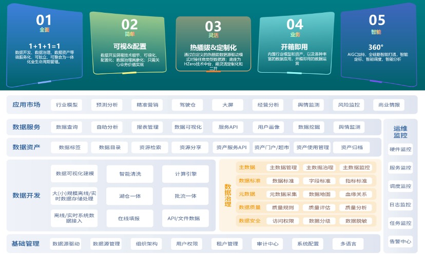 汉得 H-ONE 融合数据平台,引领企业数字化转型的“大国重器”,助力企业轻松解决数据存储计算,全方位数据治理,数字“黄金资产”-主数据的标准化、规范化管理,实现数据资产智能化运营,为企业构筑起完整而创新的数据要素生态。H-ONE 不仅是一个体系化的数据平台,更是企业数据要素价值的释放者,为您开启数据要素之旅,实现业务的全面升级,激发创新能量,打造数字化成功的新篇章!