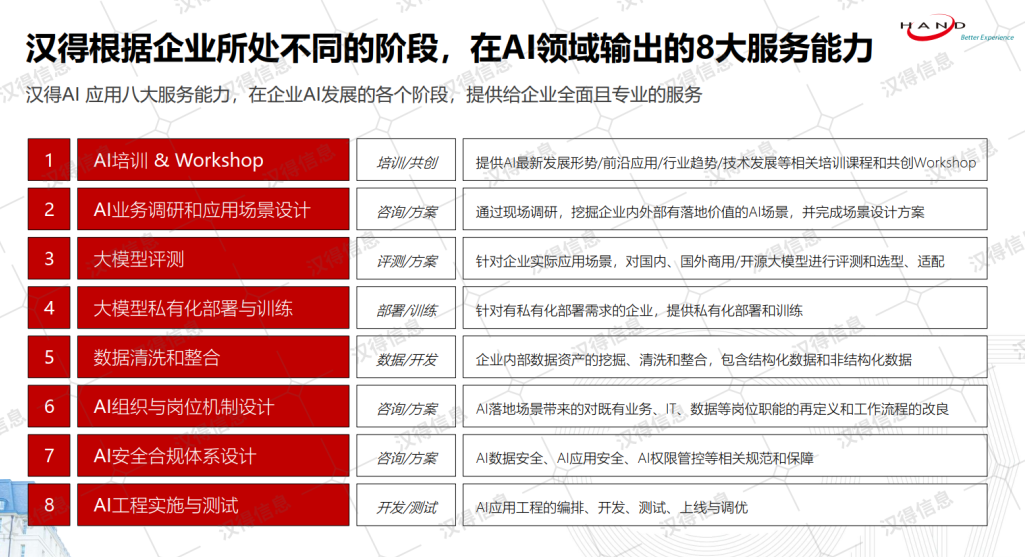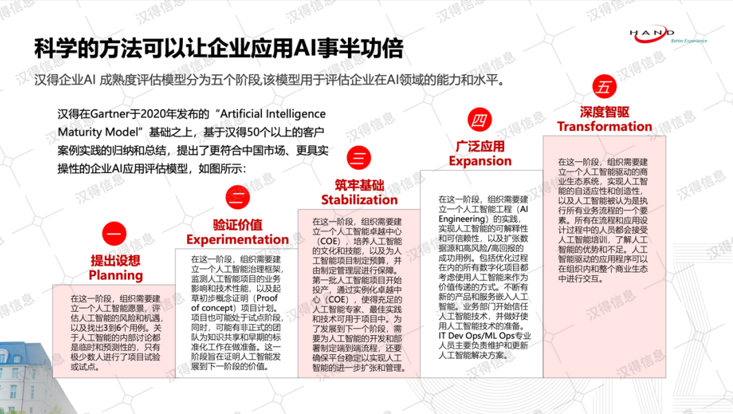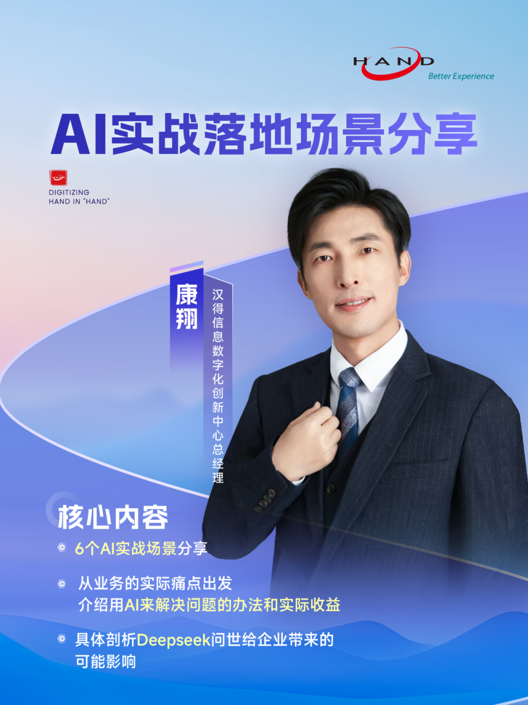 「点击图片了解更多」 近年来,人工智能技术已成为全球商业领域的热门议题。随着算法突破、算力提升与数据爆炸式增长,AI正加速走向企业实际业务场景,成为推动数智化转型的核心驱动力。然而,AI在企业端的落地面临着诸多挑战,企业AI应用与个人用户需求完全不同,需要考虑哪些问题?AI到底能做什么?边界又在哪里? 汉得始终从客户角度出发,充分考虑B端用户的关注点和特点,持续打造全面的AI应用侧能力体系,充分结合汉得20多年深厚的B端数字化积累及各大模型的能力,为企业提供体系化的产品及服务能力。 我们认为,只有通过对实际落地案例的剖析,才能获得真知灼见,帮助企业加快智能化的脚步。因此,汉得数字化创新中心总经理康翔先生,近期开展了题为《AI实战落地场景分享》专题直播。 他基于六个具有代表性的AI实践案例,从业务场景落地、技术路径选择,到组织战略规划,系统剖析了AI技术的应用价值与实践路径,为企业提供从认知对齐到行动落地的参考指南,同时分享了汉得根据企业所处不同阶段输出的八大服务能力,致力于帮助更多企业加速实现AI在B端的应用及价值变现! 案例一 构建AIGC知识库 开发专属细胞实验模型 该客户是国内某知名大学的生物研究所,面临的主要痛点是历史论文数量庞大,版本众多,且涉及各种不同语言。实验前靠人力定向查阅相关分子细胞研究的成果,几乎是不可能完成的任务。因此,该客户选择携手汉得团队用AIGC知识库,解决了查找历史文献的问题。 双方首先通过构建大模型驱动的知识库,实现文献快速检索与论文初稿生成,解决了查阅文献的问题,但AIGC的结果是概率,实验结果的记录要求严谨的逻辑唯一性。为此汉得研发团队开发了知识图谱来解决记录实验结果逻辑关系的严谨性问题。 通过对大量历史数据的回归分析,形成模型,通过输入条件,用模型跑出模拟实验的结果,可用于辅助实验,以缩短科研周期,降低科研成本,并有利于教学和知识传承。该技术投入运行后,有效帮助科研团队缩短实验周期,并节省了实验经费。 案例二 实现“手中时时有数,心中事事有数” 该客户是中国500强企业,主营业务是供应链,年营收1400亿。虽然企业很早就做了数字化建设,也做了不少BI报表,但高管们发现,在看数据、用数据上仍然存在不少痛点。 类似的问题,在很多企业都存在,其本质是用数据的人不是开发数据的人,开发数据的人并不真正要用这些数据,这种错位导致了企业内部虽然开发了一大堆BI报表,实际上真正有用的并不多,真正要用的时候却发现用不了。 汉得针对这一类型的问题,将自研的ChatBI产品与AIGC大模型进行结合,不再需要提前开发一大堆BI报表,而是通过语音或者文字将要看的数据提交给大模型,大模型转译之后,由ChatBI直接从数据库中实时取出数据,并组装成BI报表呈现出来,同时对数据权限进行管理。 这一技术功能的实现,支持企业内部各个不同层级、不同领域的人员真正做到“手中时时有数、心中事事有数”。 案例三 将AI嵌入工作流,减少出错率,降本提效 这是2022年发生的一个法律诉讼案例,某公司在贸易报关环节,由于商品归类失误而面临处罚。进出口贸易在向海关进行报关时,商品的分类要遵循海关相关规定,但由于法规不定期迭代变更、国内外对商品分类标准不一致等因素,都非常容易导致在报关环节发生失误,甚至有申报不实的处罚风险,同时也影响了进出口订单的履约周期。 企业通过引入AI Agent,结合企业历史报关数据与海关法规等打造报关智能体,借助对话式交互生成精准分类建议,实现自动获取数据、代替人工录入、避免人为错误,将此类低价值、重复性工作真正做到少人化、无人化、智能化。 案例四 借助AI服务员工,快速便捷处理报销 该客户是国内某知名龙头企业,为了简化其报销流程,优化交互体验,该企业选择携手汉得引入AI Agent,员工在报销时仅需要填写基础信息并提交报销凭证,AI就会调用各种接口去审核发票的真实性。 借助AI Agent,报销系统真正做到简化人力成本,实现大幅提效,同时还优化了员工的使用体验。 案例五 将AI应用于导购陪练 该客户是国内某知名电器企业,在全国各大商场中均有设立柜台,其面临的主要痛点是公司产品不断迭代更新,销售导购培训体系也随之变化,导购完全胜任需 3-4个月。 虽然多数客服在做选择题答卷时成绩不错,但上线后不敢回复,知识运用不灵活,很难绘制有感情、有形象的“客户”进行实操培训。 为了解决上述问题,该客户选择携手汉得团队借助AI Agent,打造“AI顾客”与导购进行交互,通过AI模拟真实购物场景,对导购话术进行评分和优化指导,并将培训时长缩短至2个月,效率翻倍。 同时用“更真实的AI买家”做产品推荐练习,快速提升销售服务能力,从而提升整体销售额。使用该模式培训的导购平均转化率高3-5%。 案例六 实现良品率提升,年收益高达数千万元 该客户是光伏切片领域的龙头企业,国内光伏切片行业平均良品率大约在93-95%左右,该客户希望提高良品率,从而降低生产成本。然而光伏切片的数控机床产线参数多达2000多个,其组合方式更是无穷无尽,要通过人工来调优是不可能完成的任务。 汉得通过对生产过程的调研,对生产过程中采集到的全部变量进行分析,找出与良品率最为相关的60个关键变量,并借助大数据分析算法,最终找到了这60多