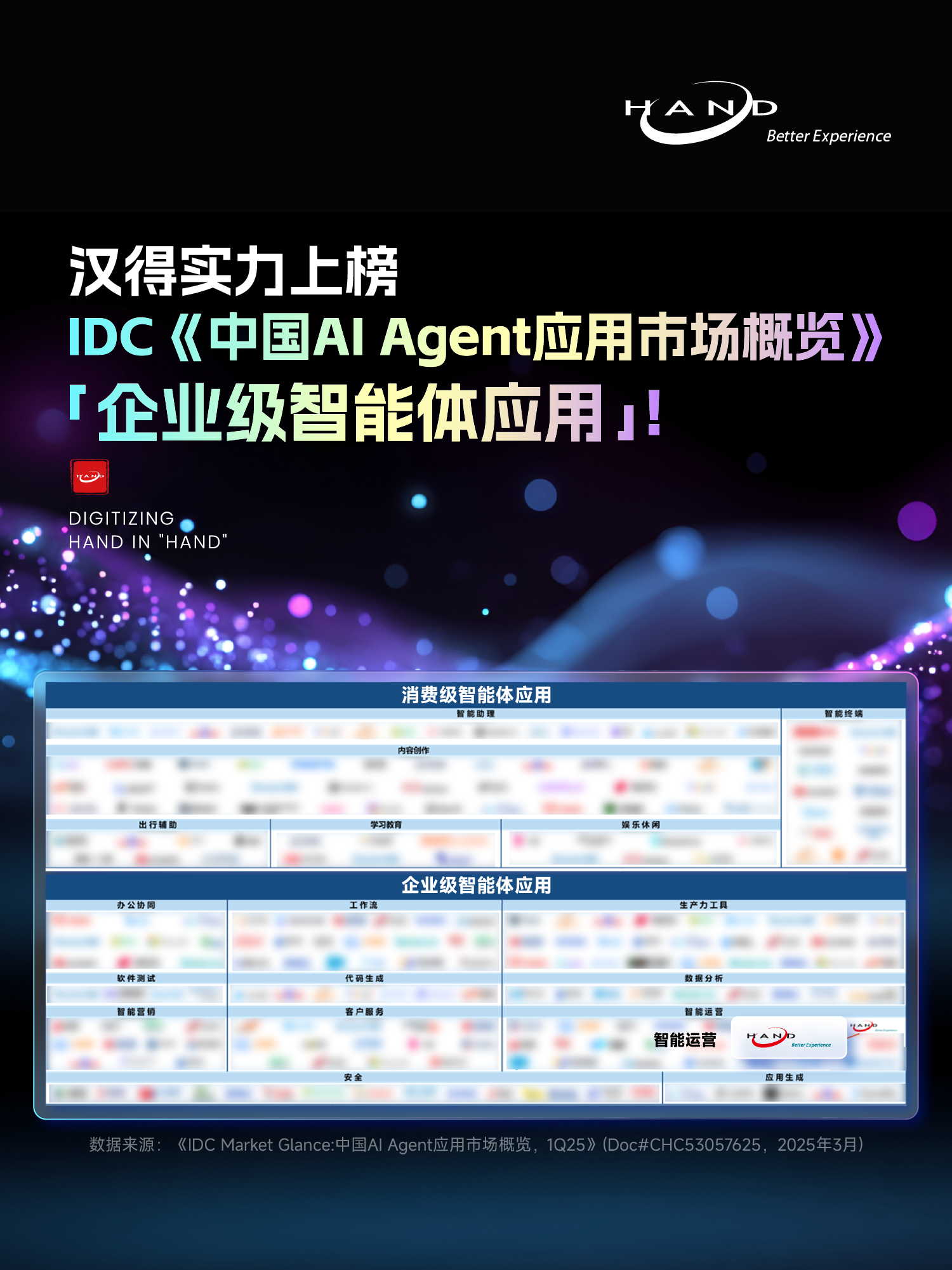 近日,国际数据公司(IDC)正式发布《IDC Market Glance:中国AI Agent应用市场概览,1Q25》(Doc#CHC53057625,2025年3月)研究报告,首次系统性梳理了中国 AI Agent 应用的市场格局。汉得专注于企业端数字化,充分考虑 B 端用户的关注点和特点,凭借全面的 B 端 AI 应用能力体系及落地实践案例,实力上榜「企业级智能体应用」,并入选「智能运营」细分领域。今年3月,汉得已正式发布 B 端 AI 应用产品/服务系列【得·灵】。这一系列包括三大产品系列+一大服务系列:“灵猿”大圣 AI 中台系列、“灵手”业务智能体系列、“灵睿”垂直模型系列,以及“灵策”配套服务系列,全面支撑企业构建 AI 能力体系及智能化升级。其中,汉得 AI 中台具备企业运用大模型的通用能力,并沉淀各类 Agent 调用工具,帮助企业快速构建、运营和持续调优智能体,融入现有业务数字化软件应用,建立更适应 Agent 运行的作业流程,发挥数字生产力价值。目前,汉得已在制造域、营销域、财务域、供应链域及其他各个业务领域,同步推出近百个成熟智能体,部分已有落地案例;同时还拥有物流、矿山、锂电等多个行业垂类模型,加快业垂类 AI 方案和私有化训练落地;发布汉得代码大模型,赋能应用系统研发效率快速提升。